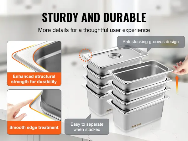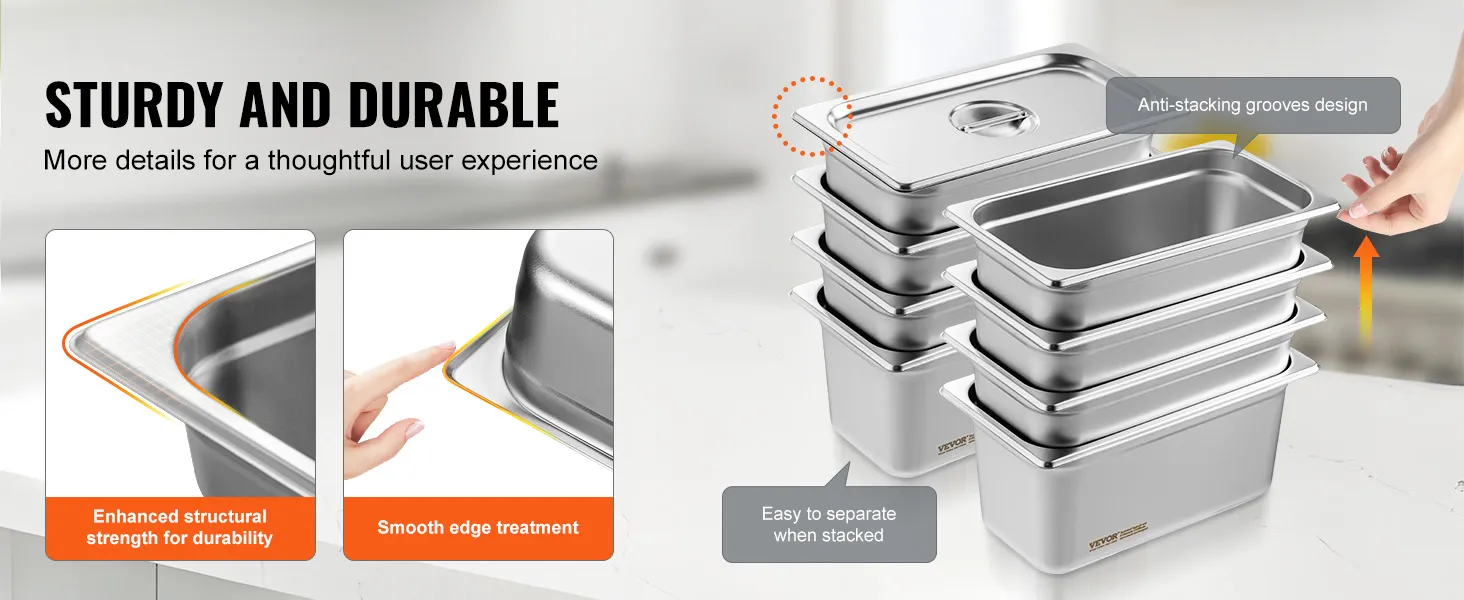 Designed with anti-stacking grooves, the stainless steel hotel pans are easy to separate when stacked and have enhanced structural strength, making them more durable.