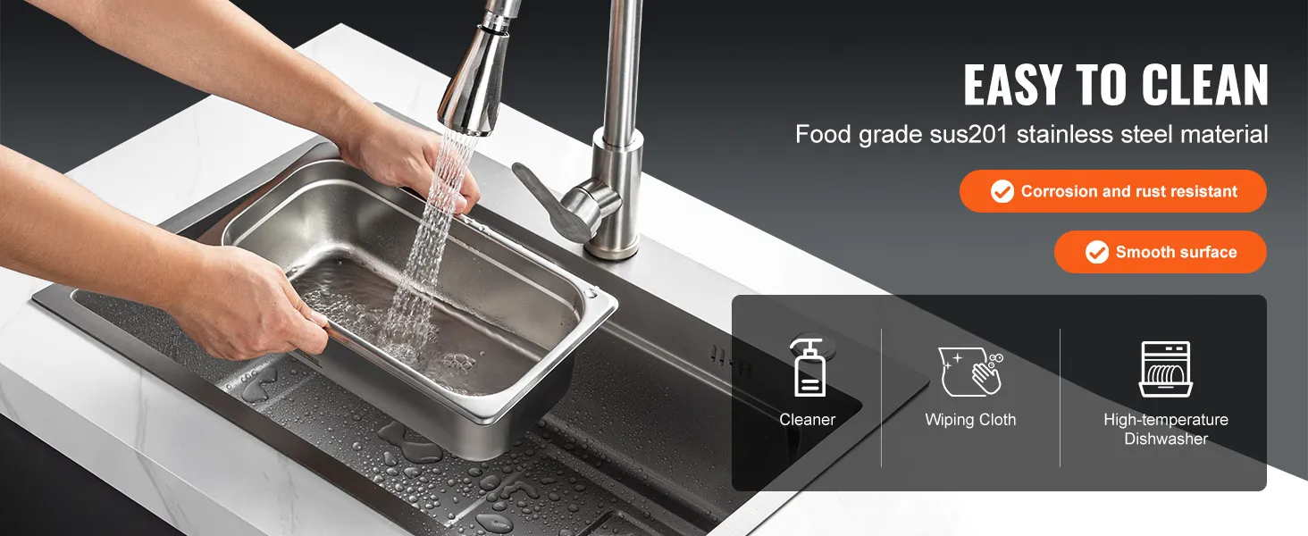 Sturdy and Durable: Our hotel steam pan is made with 0.8mm thick stainless steel, making them sturdy, durable, and rust-resistant. The unique anti-stacking groove design enhances structural strength, making the pan more robust and easy to separate when stacked.