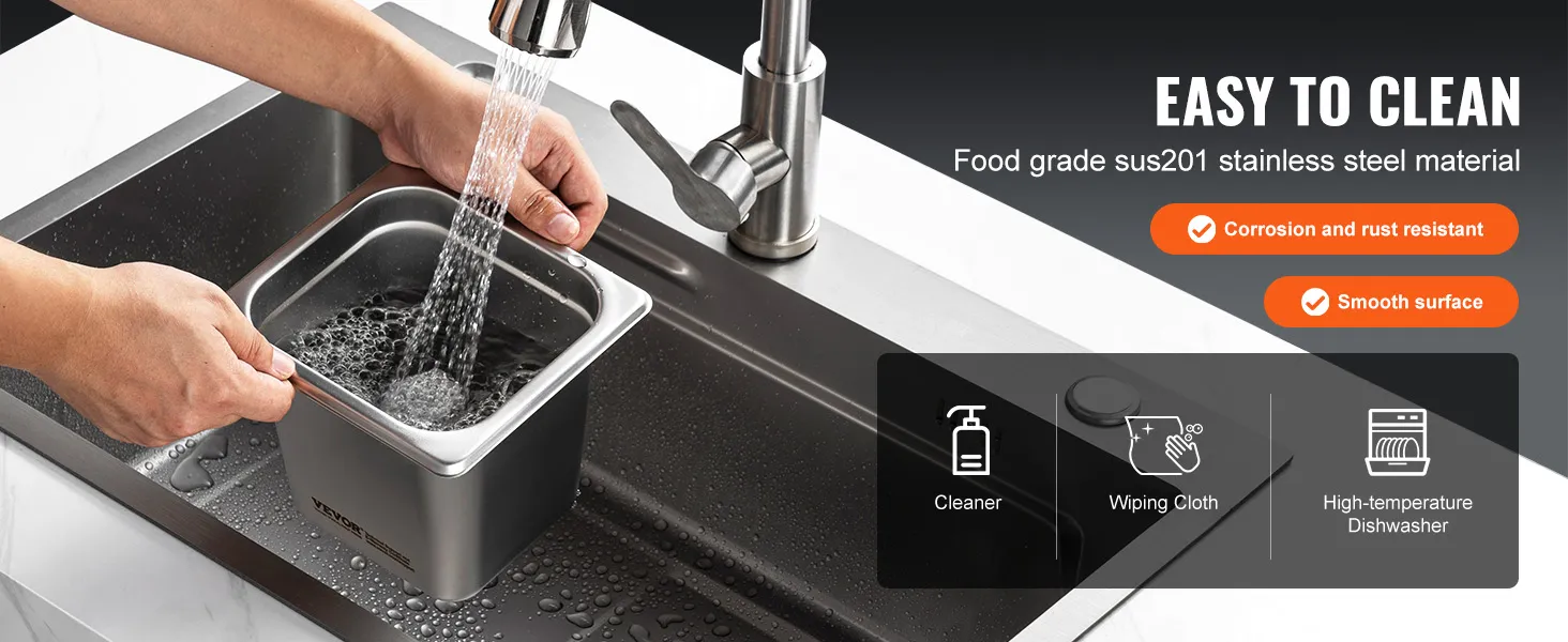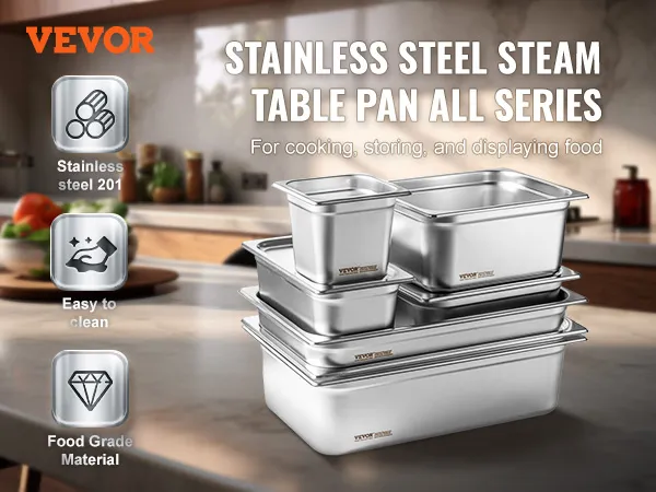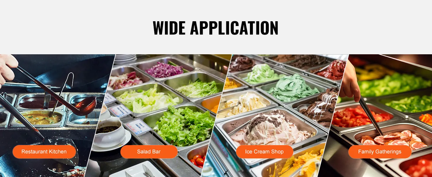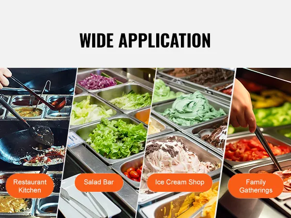 De VEVOR hotelpannen zijn perfect voor elk soort eten. Gemaakt van SUS201 roestvrij staal, gaan ze lang mee. Deze pannen zijn ideaal voor het bewaren van vlees, groenten, fruit en zelfs ijs. Ze zijn ontworpen om de ontberingen van commerciële keukens aan te kunnen. Waar u ook eten moet bewaren, vervoeren of serveren, de duurzame constructie zorgt voor langdurig gebruik. Ze zijn geschikt voor restaurants, cateringdiensten en andere voedselbedrijven.