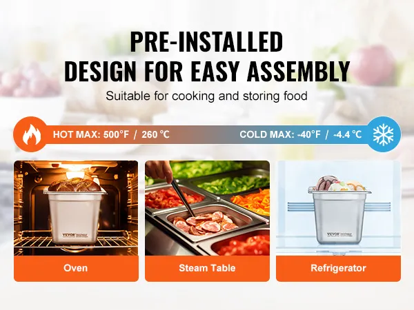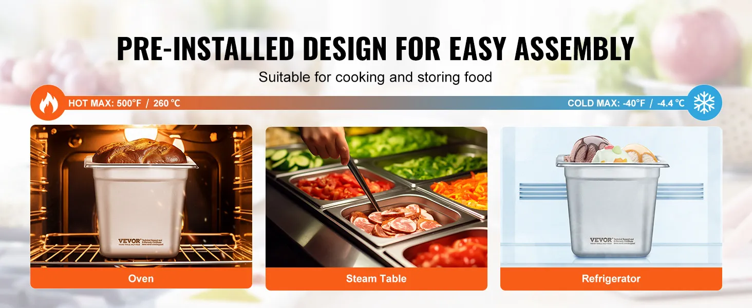 Deze anti-jam stoompannen kunnen extreme temperaturen aan. Ze zijn geschikt voor gebruik in koelkasten, vriezers, ovens en stoomtafels. Ze kunnen temperaturen tot 500°F en zo laag als -40°F weerstaan. Dit maakt ze extreem veelzijdig voor verschillende keukenomgevingen. Het maakt niet uit of u eten warm of koud moet houden, deze pannen kunnen het allemaal. Hun uitzonderlijke temperatuurbestendigheid zorgt ervoor dat uw eten op de gewenste temperatuur blijft.