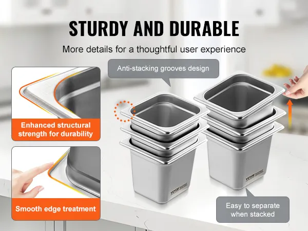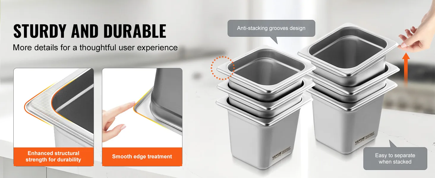 Dit maakt de pannen, gemaakt van 0,8 mm dik roestvrij staal, sterk en duurzaam. Ze zijn ook roestbestendig, wat zorgt voor langdurig gebruik. Het anti-stapelgroefontwerp draagt bij aan hun stevigheid. Bovendien maakt het ontwerp het eenvoudig om de pannen te scheiden wanneer ze worden gestapeld. Deze roestvrijstalen tafelpannen kunnen zware lasten aan zonder te buigen of te breken. Deze pannen zijn ideaal voor gebruik in drukke keukens en cateringdiensten.