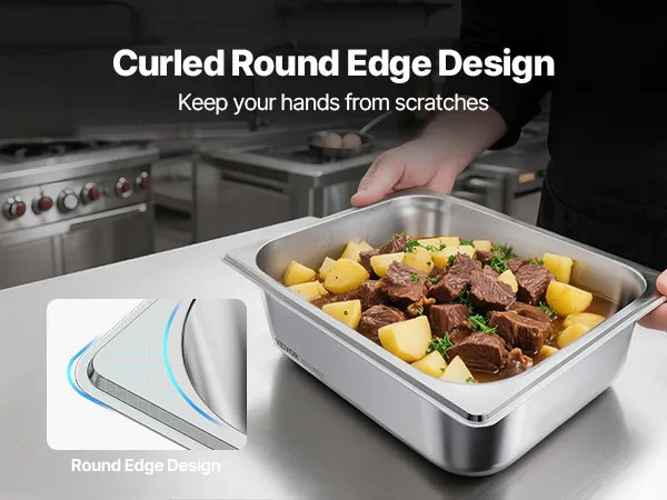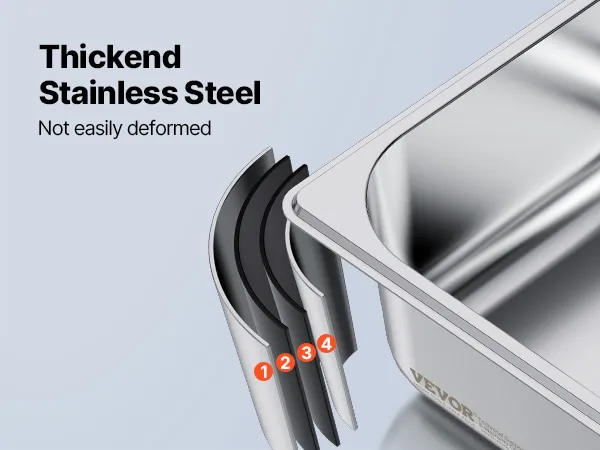 Deze Gastronormbak is gemaakt van roestvrij staal van commerciële kwaliteit SS201 (22 gauge), wat zorgt voor hoge sterkte en roestbestendigheid. De pannenset met een diameter van 98 mm en een halve maat voldoet aan de dagelijkse kookbehoeften en is perfect voor het bereiden, bewaren en presenteren van gerechten zoals vlees, groenten, fruit en zelfs ijs.