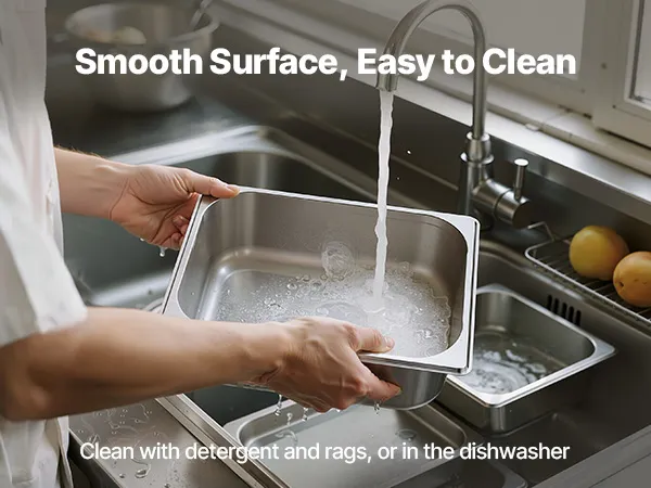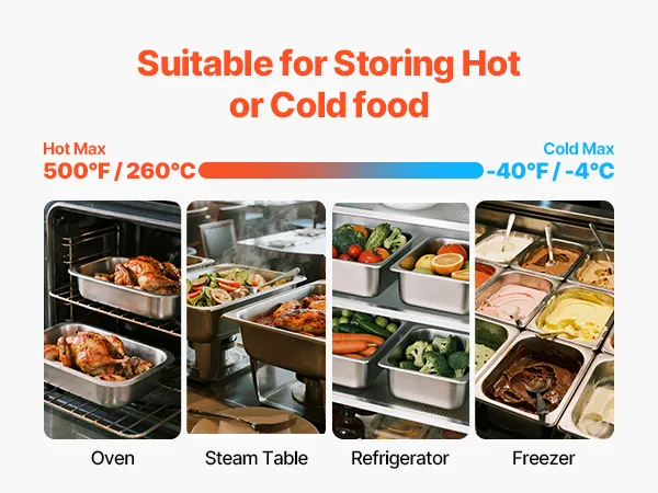 Roestvrij staal van commerciële kwaliteit: Onze Gastronorm-container is gemaakt van roestvrij staal van commerciële kwaliteit (22 gauge) SS201, wat zorgt voor een lange levensduur en uitstekende roestbestendigheid. Hij is ideaal voor warme en koude gerechten en is bestand tegen temperaturen van -40 tot 500 °F (-4 tot 260 °C). Geschikt voor professionele vaatwassers met hoge temperaturen, koelkasten, vriezers en meer.
