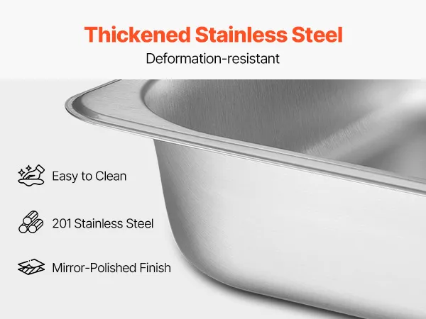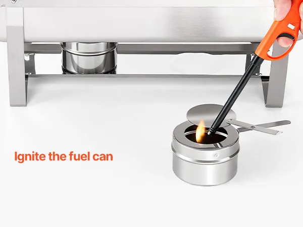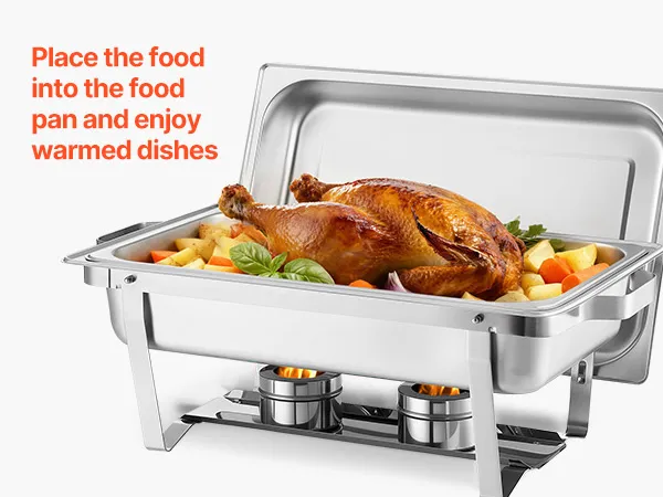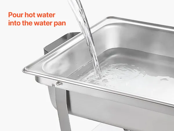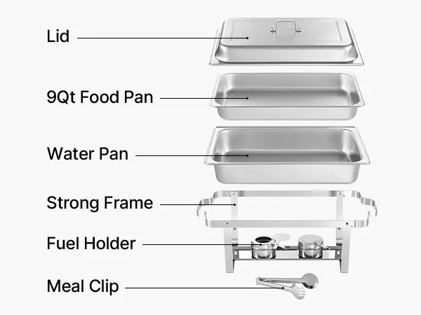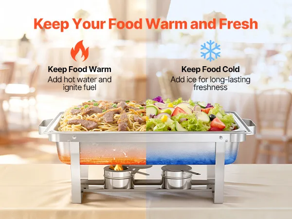 Flexibele verwarming: Serveer eenvoudig warme of koude gerechten met onze chafing pan houder. Brandstofreservoirs houden het eten warm, terwijl de waterbak ijsblokjes kan bevatten om het eten te koelen. De gerolde en gladde randen van de pannen maken het hanteren van eten gemakkelijk en comfortabel.