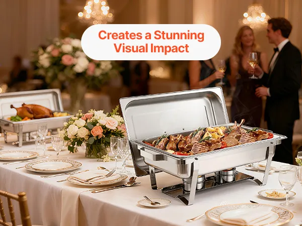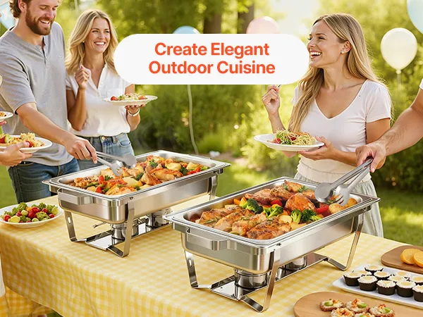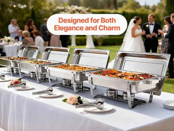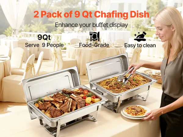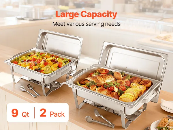 Ruime serveerruimte: Deze tweedelige chafing dish set is ontworpen voor efficiëntie en biedt plaats aan grote schalen met een inhoud tot 8,5 liter per schaal. Hij is gemakkelijk geschikt voor minimaal acht personen met voorgerechten, hoofdgerechten of bijgerechten, en biedt voldoende ruimte voor dagelijks koken of speciale buffetten.
