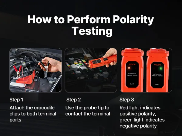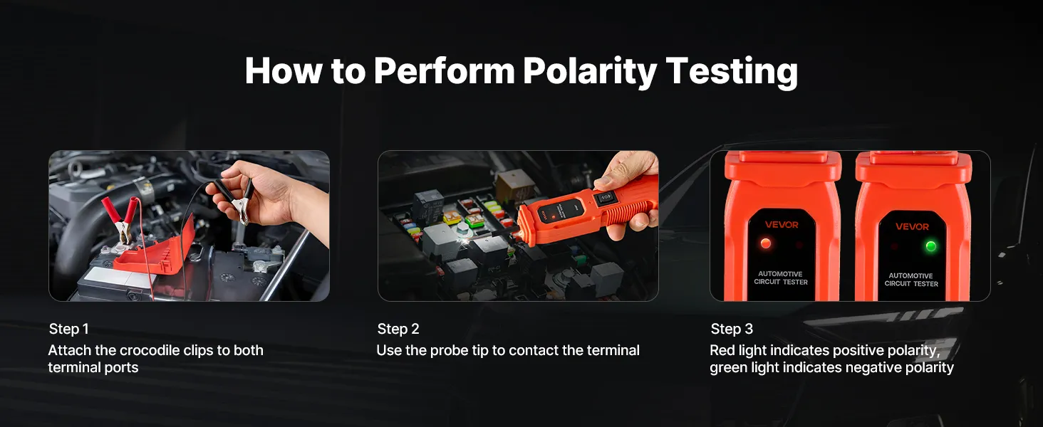 Met deze circuittester kunt u de polariteit van onveilige voertuigcircuitcontacten testen in drie snelle en eenvoudige stappen. Hij is relatief eenvoudig te leren gebruiken.