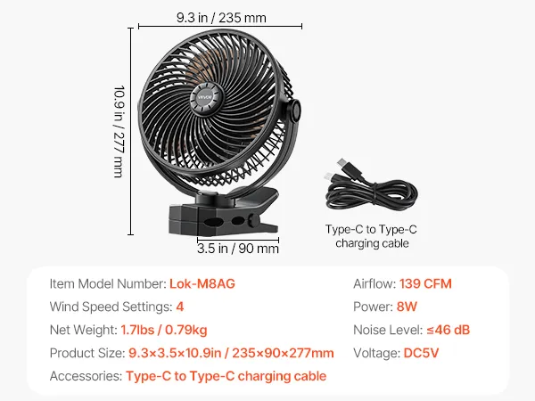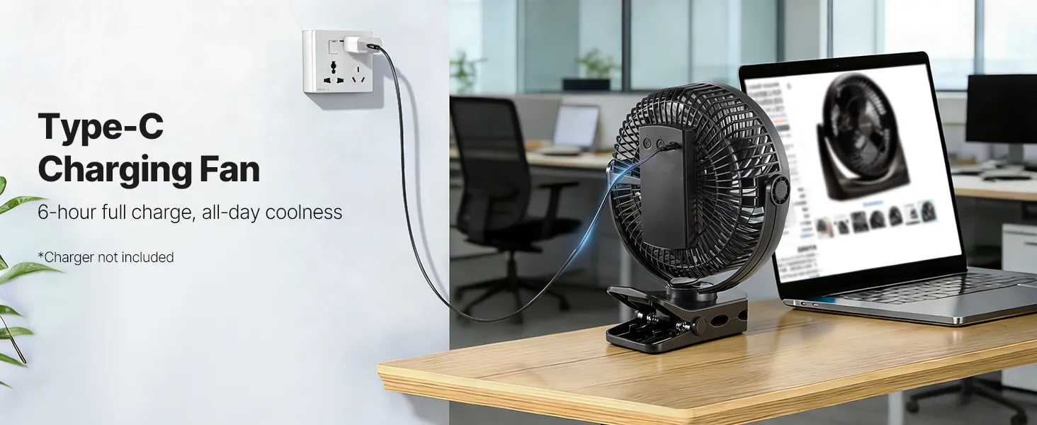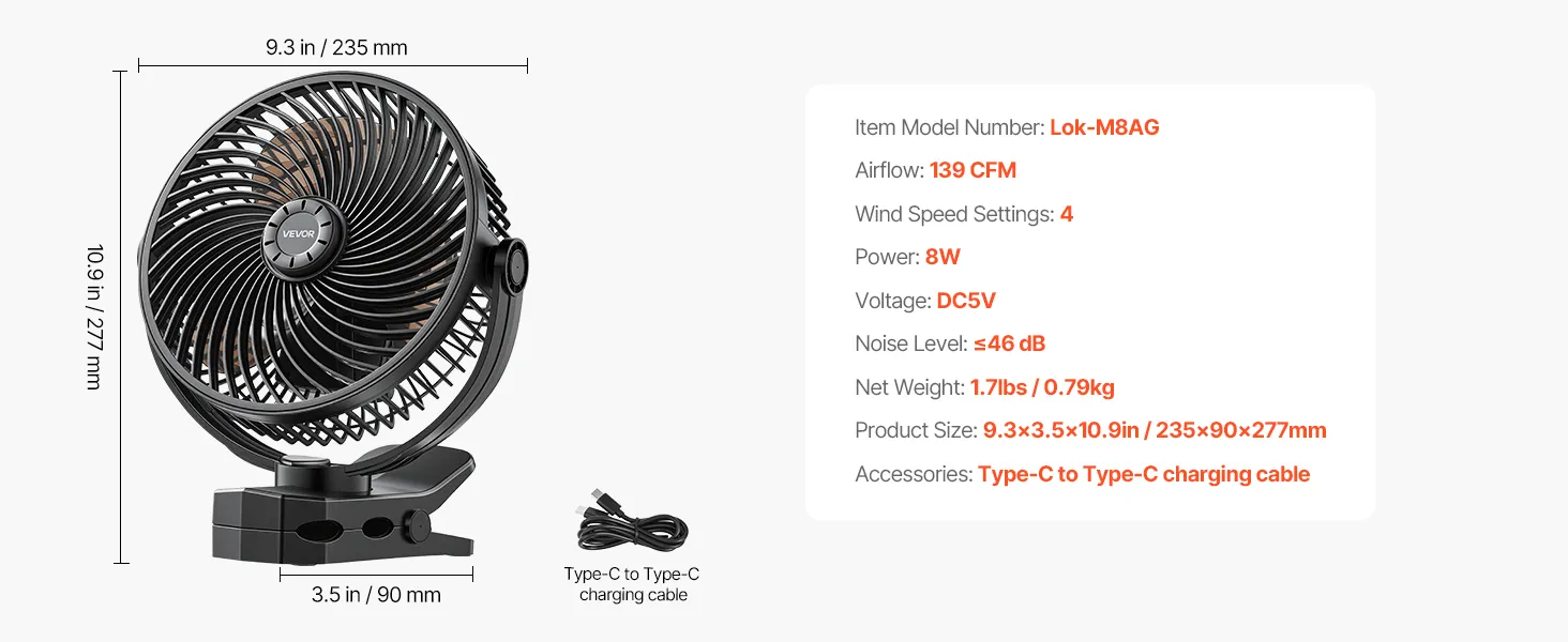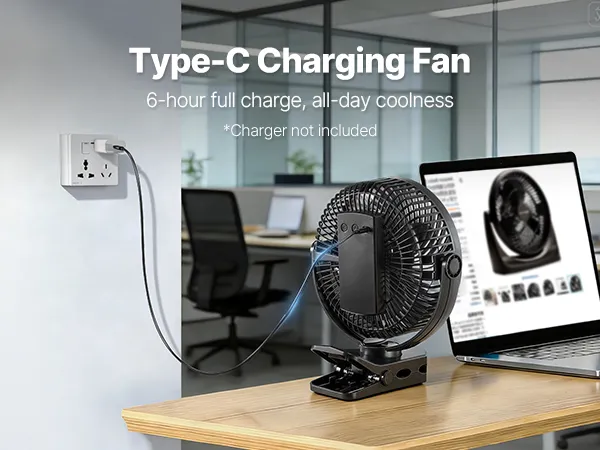 Compatibiliteit met snelladen: Deze clipventilator wordt geleverd met een USB-C-kabel van 1 meter en ondersteunt opladen via stroomadapters of powerbanks. De USB-C-poort is compatibel met diverse apparaten, waardoor hij ideaal is voor kamperen, reizen en dagelijks mobiel gebruik.