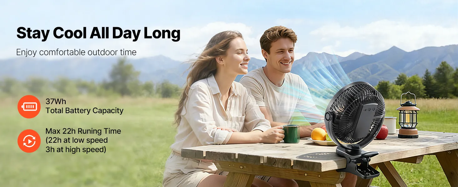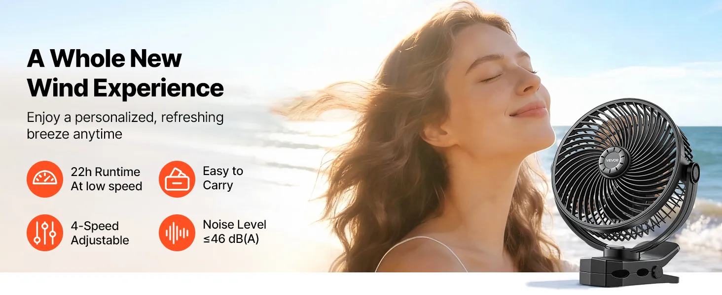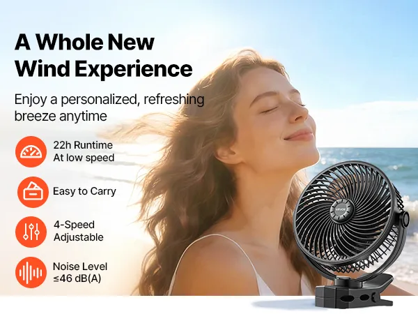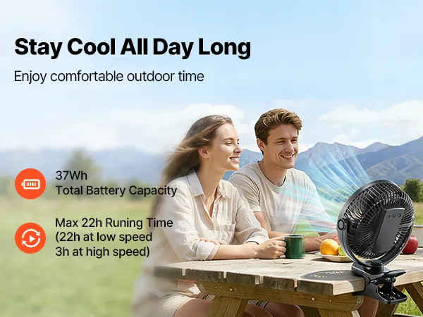 Geniet de hele dag van aangename verkoeling, van uw ochtendlectuur tot uw avondslaapje. Met een gebruiksduur tot wel 22 uur op de laagste stand (geteste gegevens) is deze kleine clipventilator een betrouwbare metgezel gedurende de nacht.