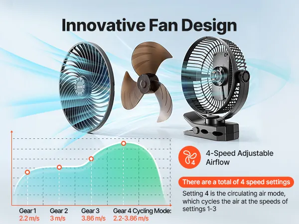 4 luchtstroomstanden: Deze kleine tafelventilator biedt drie vaste snelheidsstanden en een circulatiestand met automatische luchtstroomregeling. Compact en lichtgewicht, ideaal voor thuis, op kantoor of op reis.