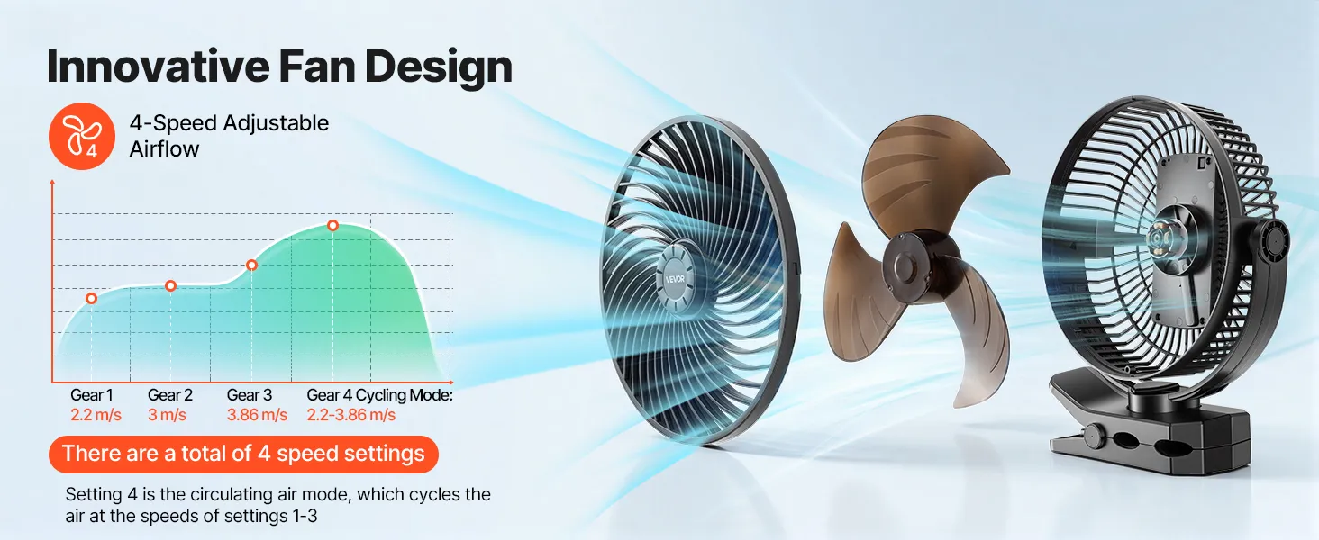 Krachtige luchtstroom (3,86 m/s): Deze clip-on ventilator is uitgerust met een 170 mm driebladige ventilator en een 8 W koperen motor en levert een luchtstroom tot 139 CFM. Drie instelbare snelheidsstanden (2,2 / 3,0 / 3,86 m/s) zorgen voor nauwkeurige controle met een geluidsniveau van minder dan 46 dB.