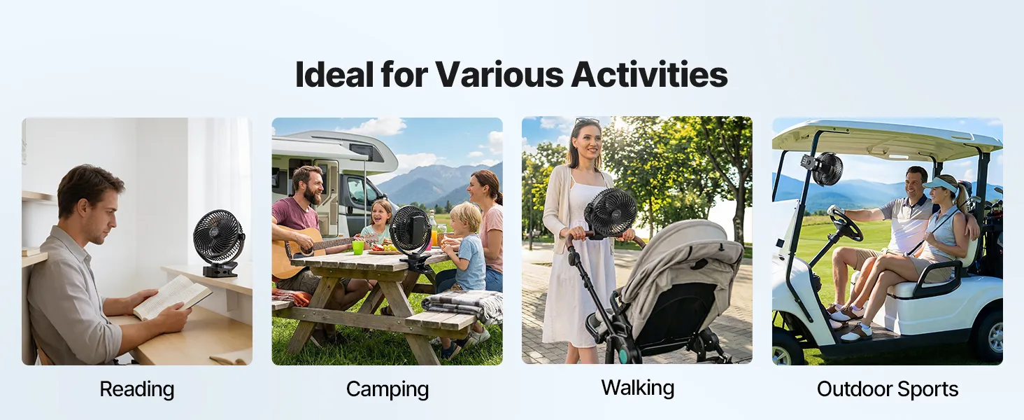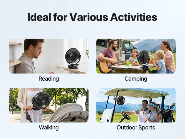 Deze clipventilator is ontworpen voor de moderne levensstijl en kan eenvoudig worden bevestigd aan bureaus, nachtkastjes, loopbanden en tentranden. Als veelzijdige tafel- en loopbandventilator zorgt hij voor luchtcirculatie tijdens het studeren, slapen, sporten en andere dagelijkse activiteiten.