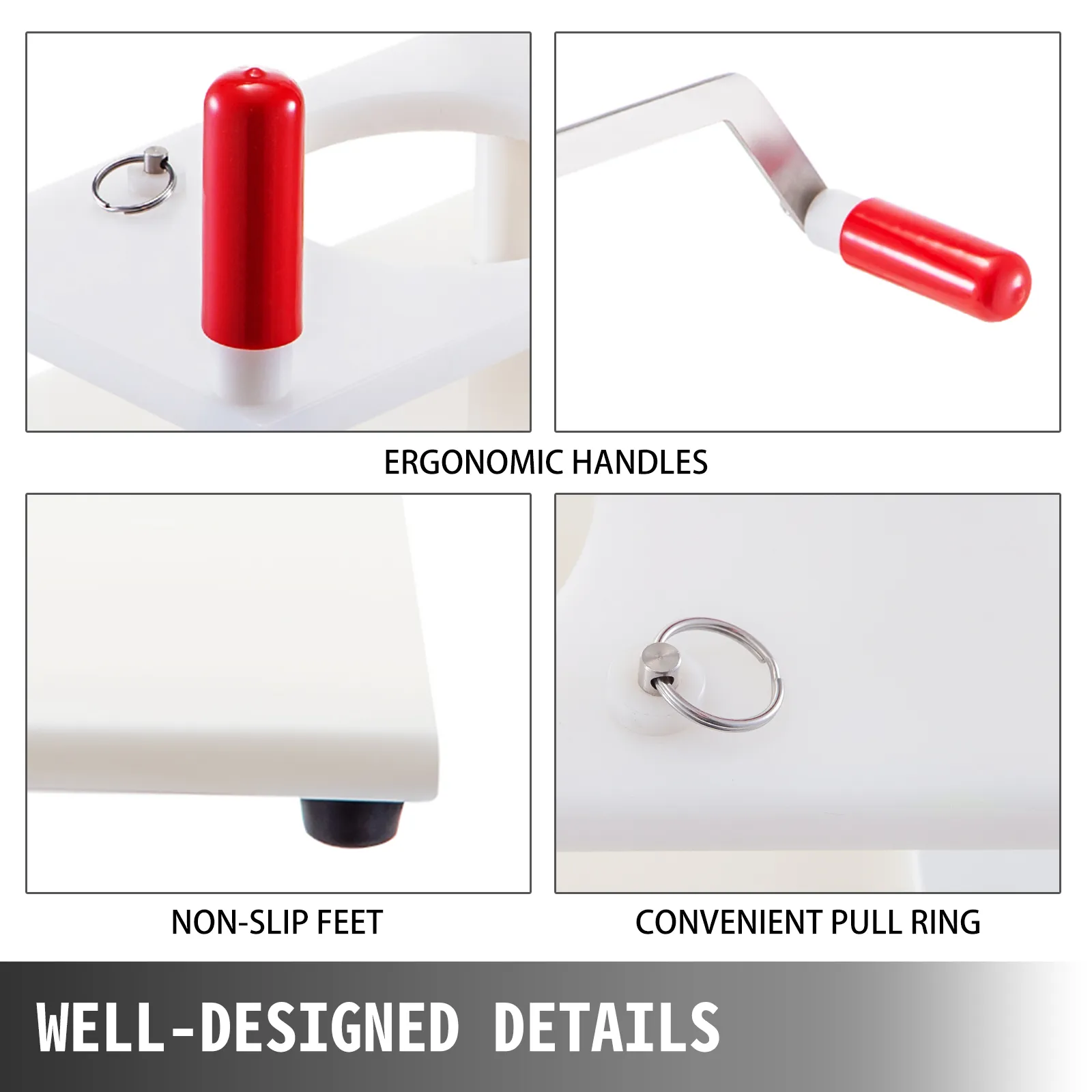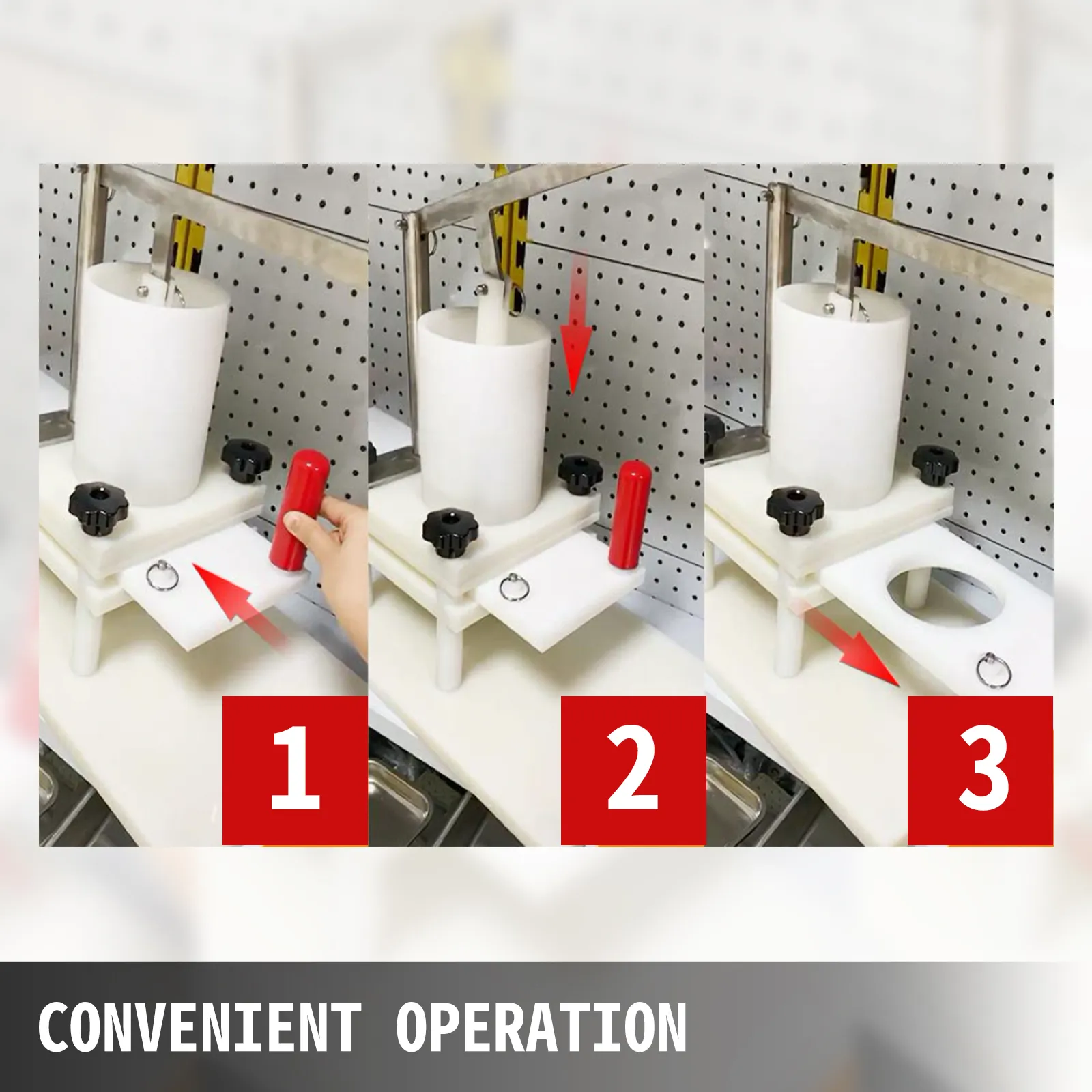 De ergonomische handgrepen vergemakkelijken het gemakkelijk aandrukken van pasteitjes en gemakkelijk uittrekken van de vorm; antislipvoetjes zorgen voor de stabiliteit van de machine; de trekringen spelen een vaste rol bij het trekken en duwen van de mal.