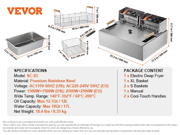 Large Capacity: By using a 12.7 Qt (12 L) oil tank (water capacity: max. 18 Qt/17 L), this commercial electric deep fryer allows you to fry large foods in one large basket, such as 2 whole chickens. It also features 2 removable baskets so you can fry different types of foods individually while retaining the unique flavor of each one. It is good for delis, food stalls, snack bars and parties.
