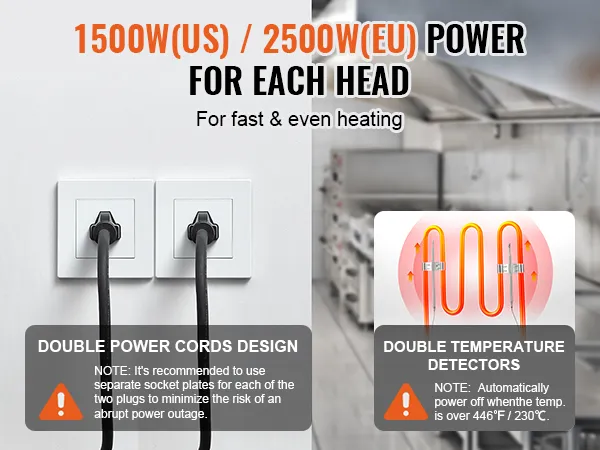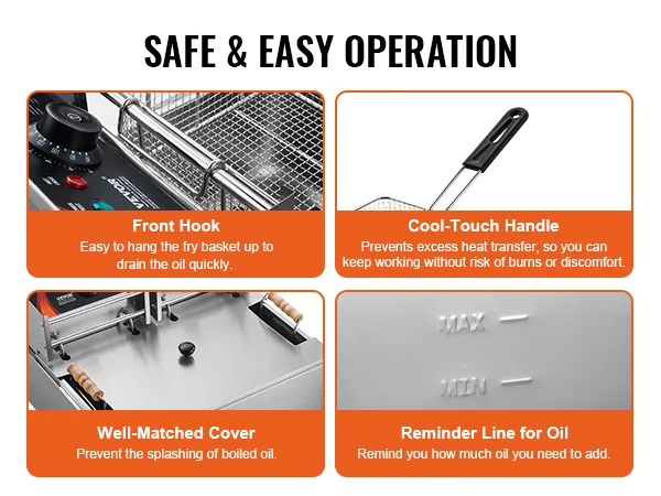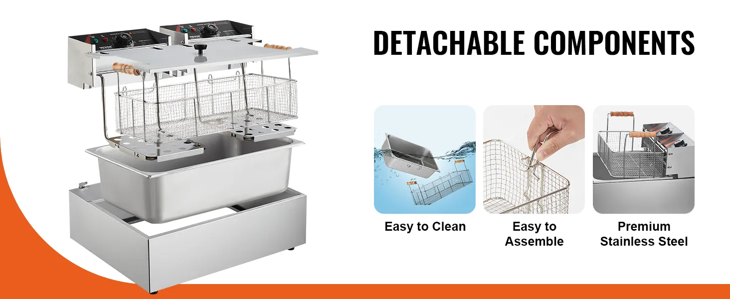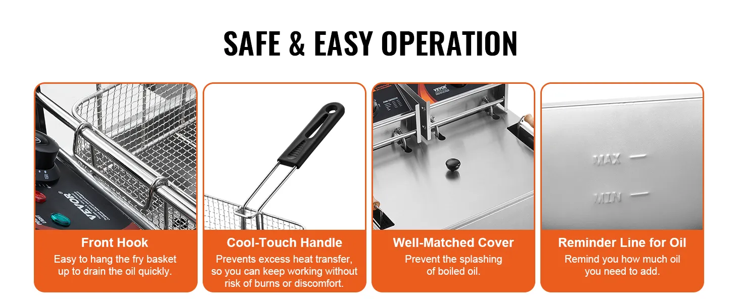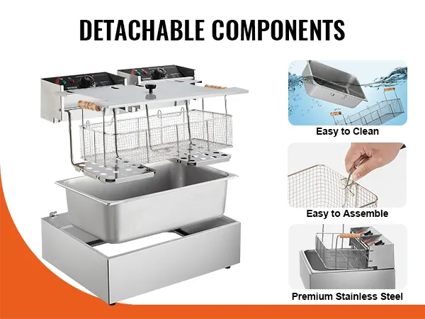 Easy to Clean: All components of this commercial deep fryer are easily removable, including the oil tank. And guess what? The stainless steel exterior is easy to wipe clean. Note: 1. Please peel off all white plastic protective films. 2. Always make sure the machine is cool and dry before cleaning. 3. Use separate outlet plates for each of the two plugs to minimize the risk of unexpected power outage (plug them into a wall outlet, not an outlet with a wiring plate).