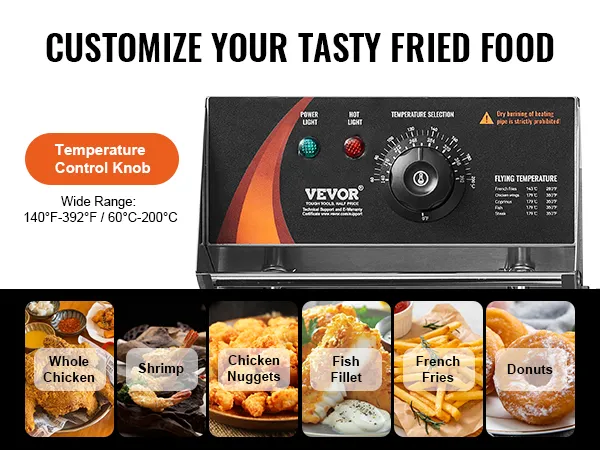 Temperature Control: Independent thermostat control allows you to easily adjust the temperature from 140°F to 392°F (60°C to 200°C). No matter what, you're ready to make it hot! This commercial deep fryer will automatically shut off if the temperature is above 446°F (230°C) or the temperature controller fails.