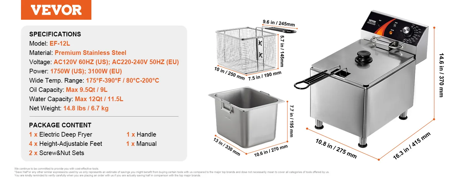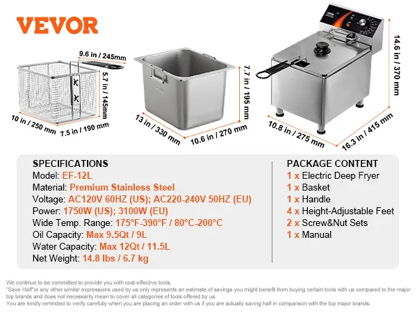 VEVOR Commercial Deep Fryer, 1750W Electric Countertop Fryer with Basket & Height-Adjustable Feet, 12Qt / 11.5L Stainless Steel Single Oil Fryer, Temp Control, Overheat Protection, for Restaurant Use