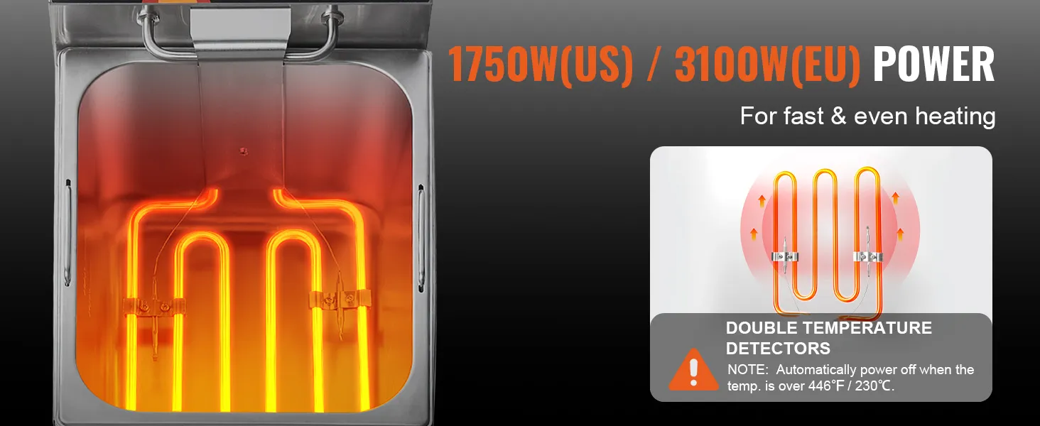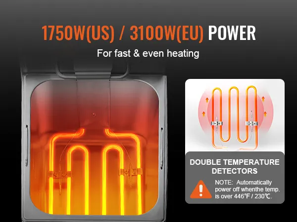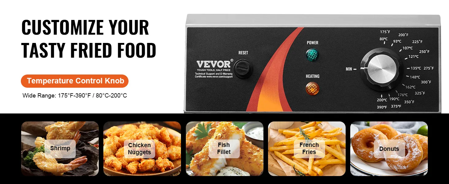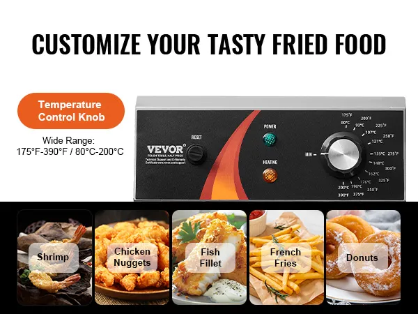 Temperature Control: You can easily adjust the temperature from 80°C to 200°C (175°F to 390°F). No matter what, you're ready to make it hot! This fryer will automatically shut off if the temperature is above 230°C (446°F) or the temperature control fails.