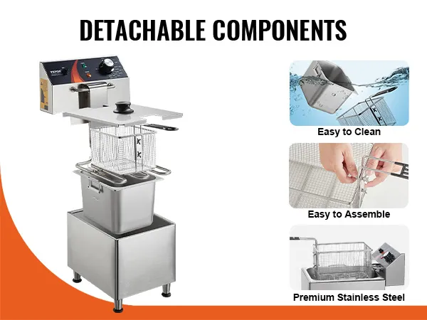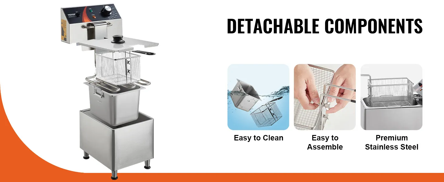 Easy to Clean: All components of this electric deep fryer are easy to remove, including the oil tank. And guess what? The stainless steel exterior is easy to wipe clean. Note: 1. Please peel off any white plastic protective film from the surface. 2. Always make sure the machine is cool and dry before cleaning.