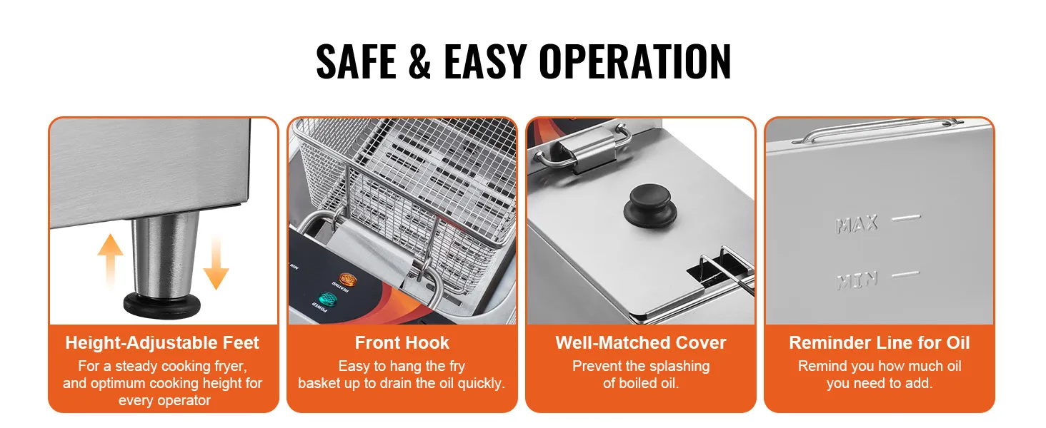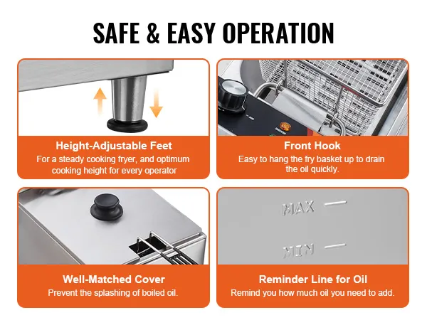Detailed information for you: The feet are adjustable to ensure a stable fryer and optimal cooking height for each user. The matching cover minimizes splashes of hot oil. In addition, the front hook makes it easy to hang the basket to drain the oil quickly.