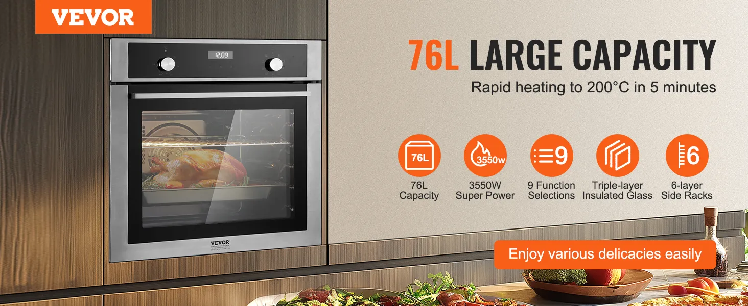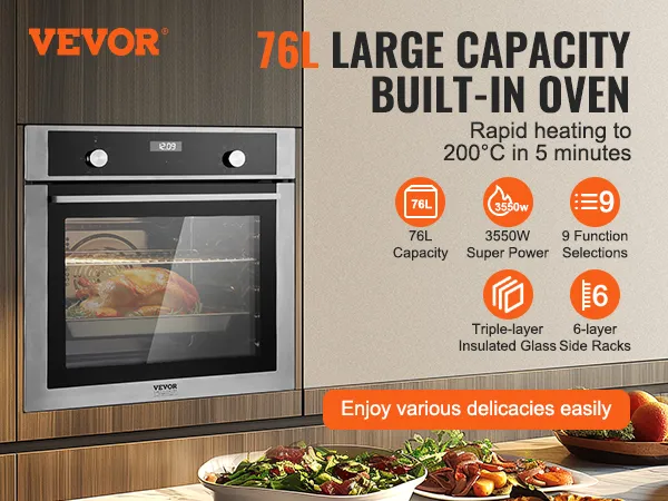 Designed with a 76L large capacity and 3550W high power, this single wall oven can quickly heat up to 200°C within 5 minutes, reducing preheating time and reaching cooking temperatures rapidly, unlocking delicious meals without waiting.