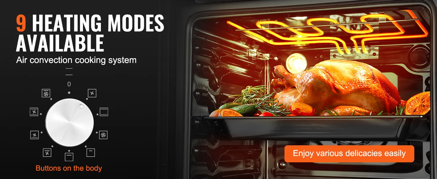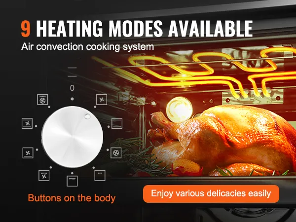 Choose from 9 functional modes with a powerful convection cooking system that circulates hot air evenly from all sides, providing ideal temperatures and airflow for quick preheating and uniform cooking.