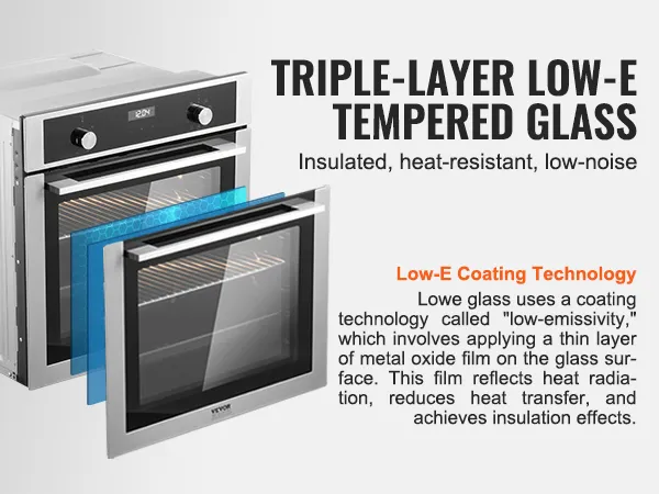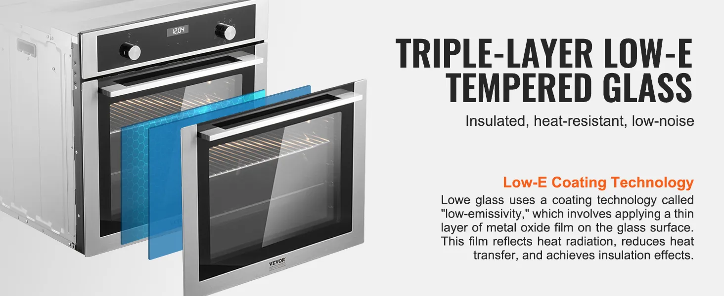 Heat Insulation, Energy-Efficient, Low Noise: Equipped with triple-layer tempered glass and low-radiation coating technology. The Low-E glass effectively reduces heat transfer, keeping the oven’s exterior cool to the touch, and maintains low noise levels to prevent burns and noise disturbance.