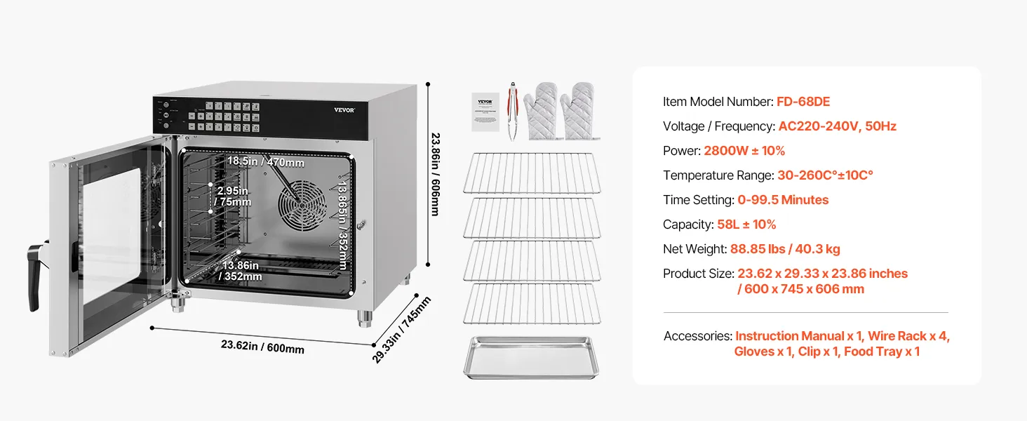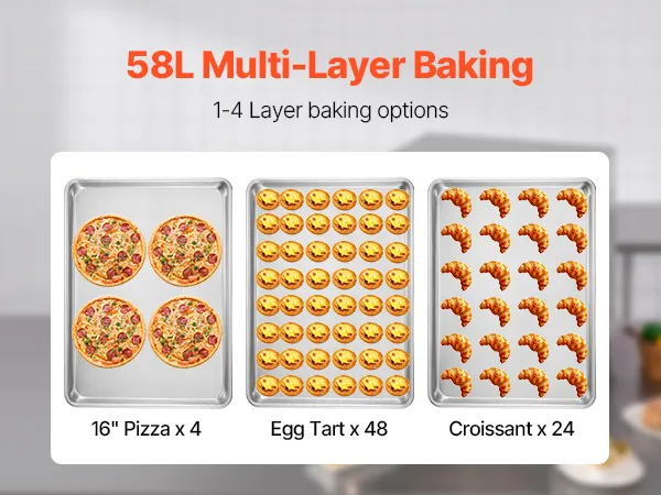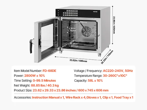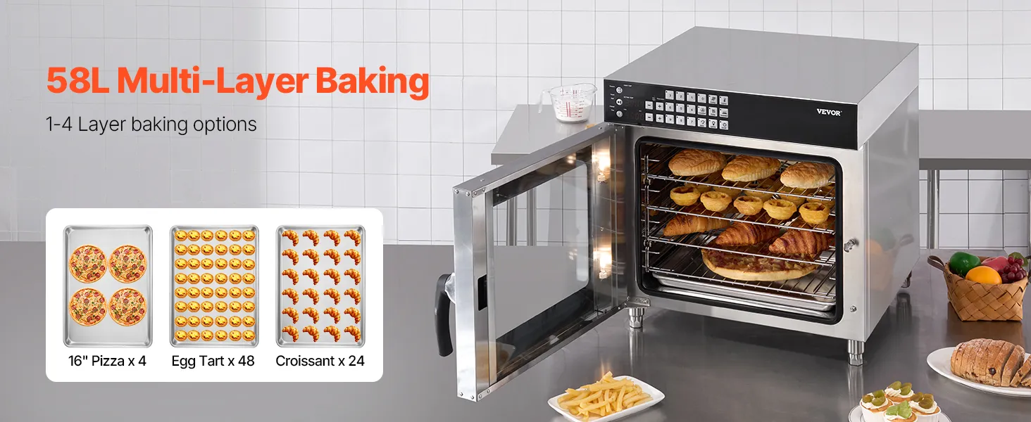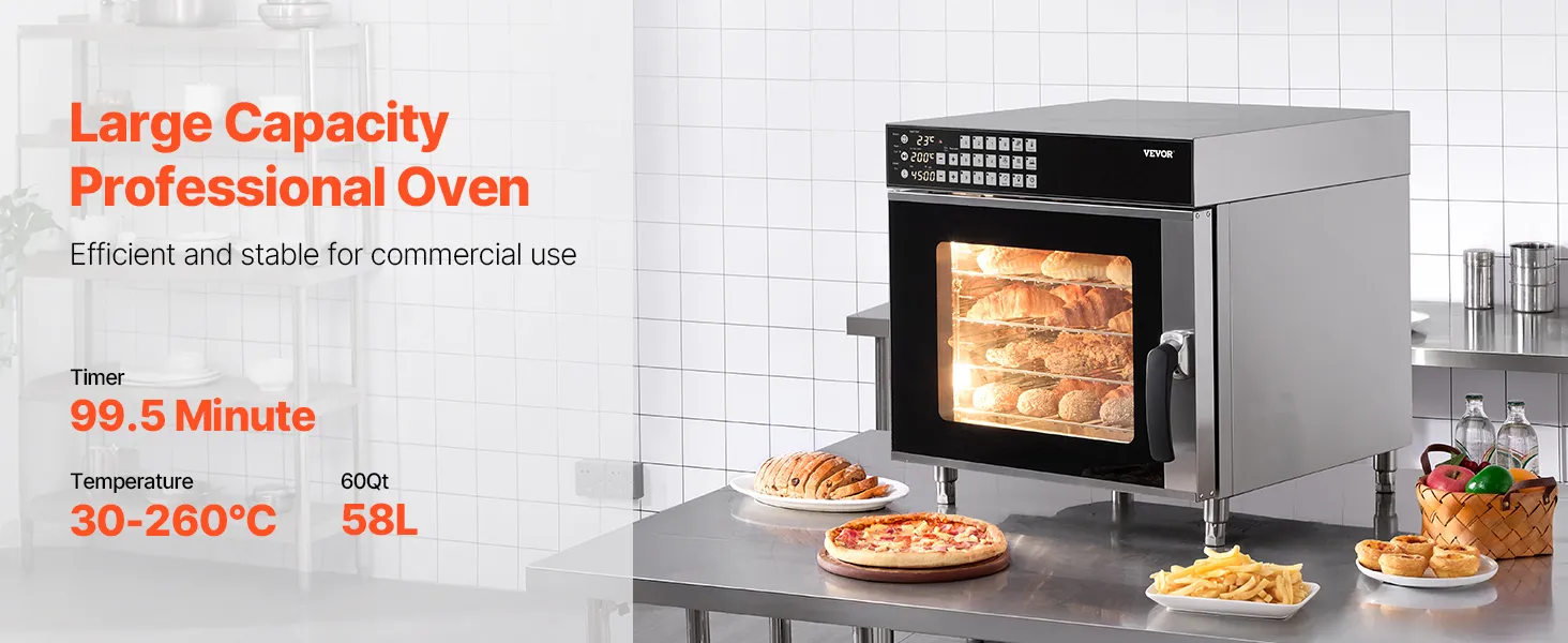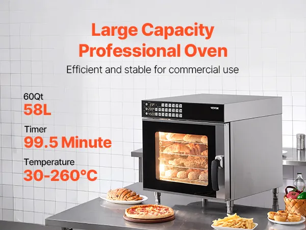 De heteluchtoven van 58 liter is ontworpen voor betrouwbare prestaties. Het is uitgerust met professionele functies voor commercieel gebruik: grote capaciteit, hoge prestaties, instelbare timer en temperatuur, duurzaam en stabiel voor dagelijks gebruik.