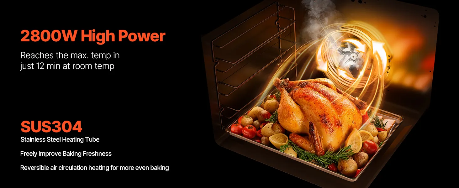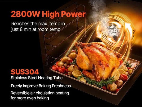 2800 W hoog vermogen voor snelle, gelijkmatige warmteverdeling, waardoor problemen zoals verbrand of onvoldoende verhit voedsel worden vermeden. Behaal knapperige, goudbruine resultaten zonder het voedsel te hoeven omdraaien.
