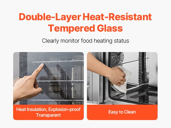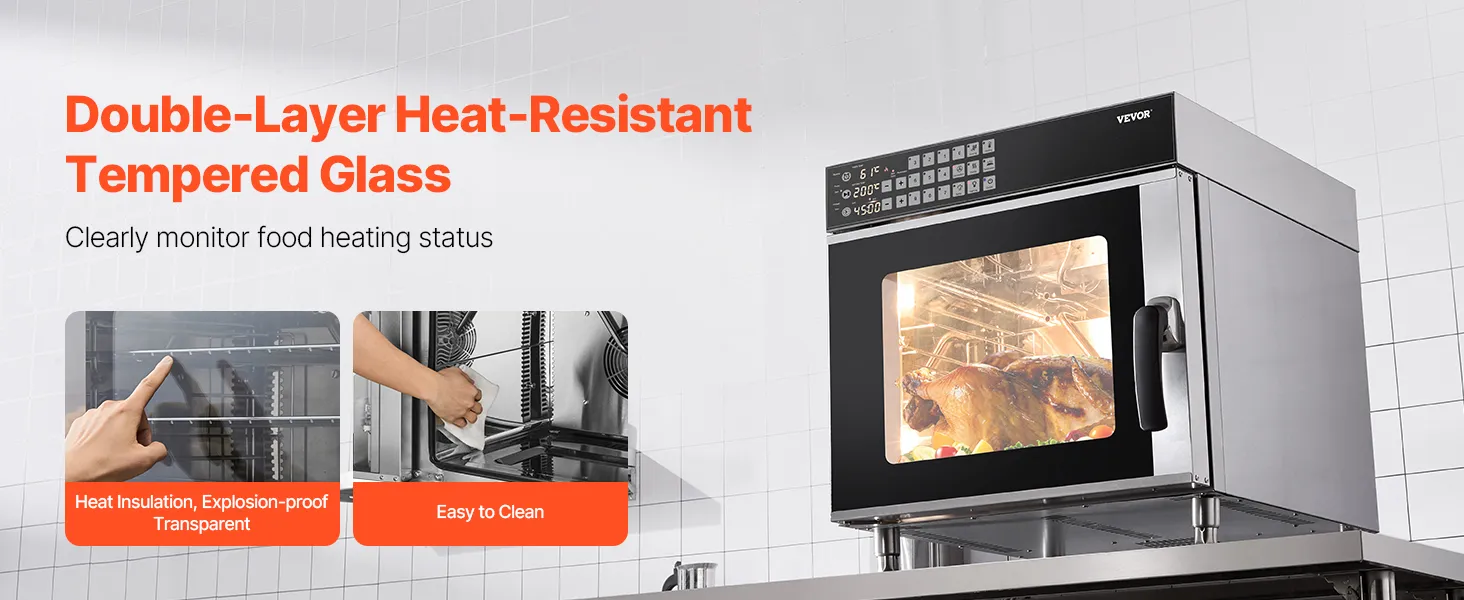 Efficiënt en snel verwarmen: met een krachtig verwarmingsvermogen van 2800 W maakt deze commerciële tafeloven gebruik van hete luchtcirculatie voor een gelijkmatige warmteverdeling, waardoor consistente kookresultaten en een uitstekend uiterlijk worden gegarandeerd. Er is geen externe ventilatie nodig, waardoor het gemakkelijk en veilig te gebruiken is