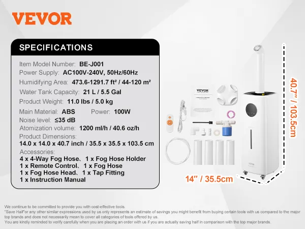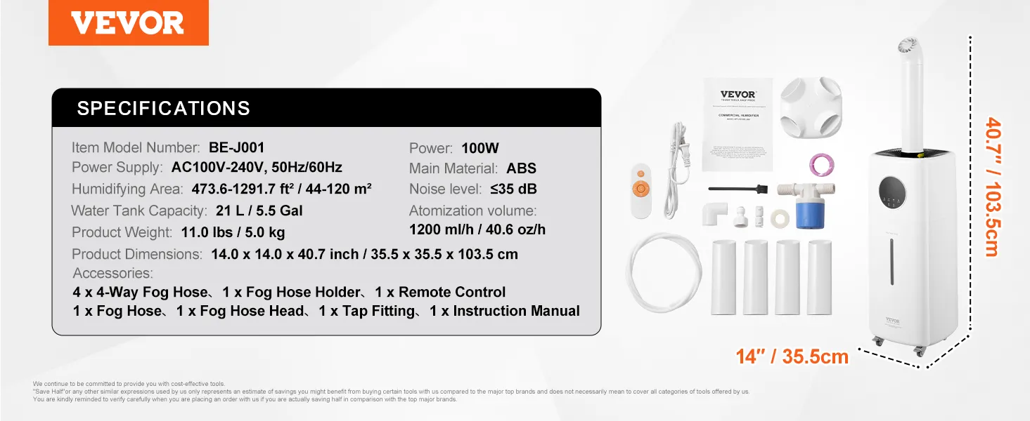 Commerciële bevochtiging: de ultrasone industriële luchtbevochtiger met een grote watertank van 21 liter kan kamers met een oppervlakte van 44-120 m² bevochtigen, geschikt voor het bevochtigen van hele huizen, kassen, supermarkten, magazijnen, kantoren, fabrieken en meer. Machinegeluid ≤ 35 dB, equivalent aan gefluister.