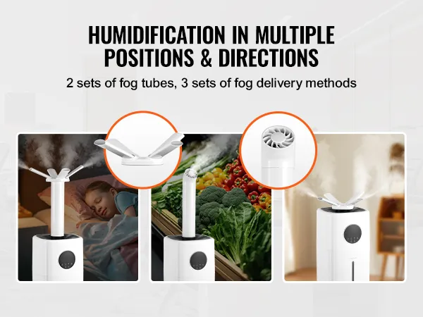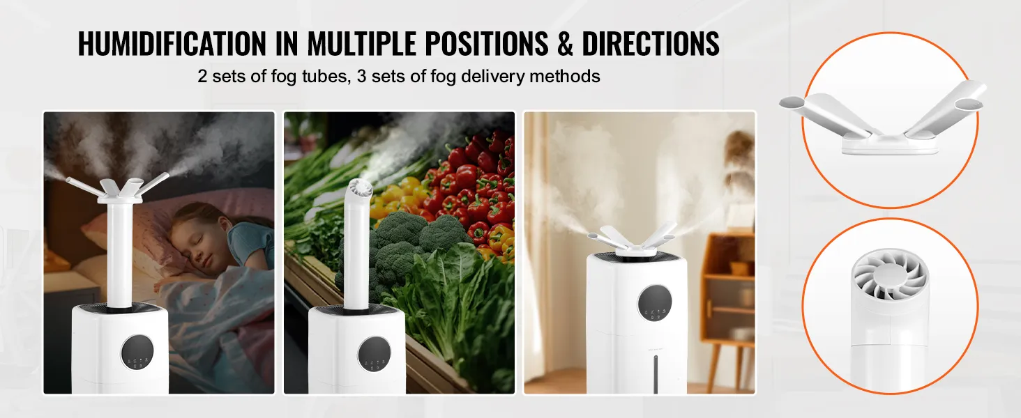 Meerdere mistuitlaatpijpen: Uitgerust met een 4-weg mistuitlaatpijp, een lange mistuitlaatpijp en een pijpdop, die 3 mistuitlaatmethoden combineert en compatibel is met lage en hoge bevochtiging. De mistrichting kan handmatig worden aangepast voor een verscheidenheid aan toepassingen, zoals: B. Planten- en groenteteelt en bevochtiging, antistatisch en stofverwijdering. Het mistvolume kan worden aangepast tussen laag, gemiddeld en hoog, met een maximale watermistopbrengst van 1200 ml/u.