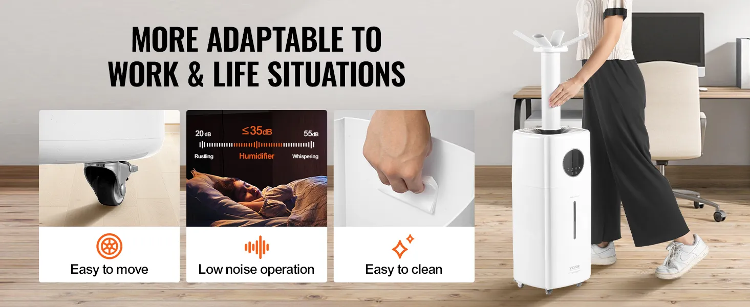 Handig verplaatsen en eenvoudige bediening: Door de onderste wielen is hij gemakkelijk te verplaatsen in grote ruimtes. Groot watervulkaliber voor gemakkelijk afvegen. De essentiële oliën van uw voorkeur kunnen aan de diffuserdoos worden toegevoegd.