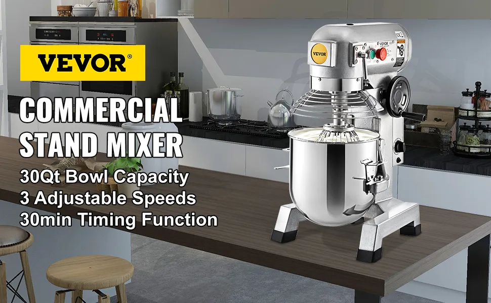 Onze keukenmixer heeft een 30 Qt kom om een groot aantal voedsel tegelijk te mengen. De roestvrijstalen mengonderdelen van voedingskwaliteit zijn stevig en duurzaam in gebruik. Het keurt een krachtige motor met 3 regelbare snelheden goed. Drie mengroerders zijn uitgerust voor veelzijdig gebruik. Bovendien is hij eenvoudig te bedienen met timerfunctie, afneembare onderdelen, de verstelbare komhoogte en een veiligheidsbeugel. Deze foodmixer is ideaal voor kookliefhebbers.