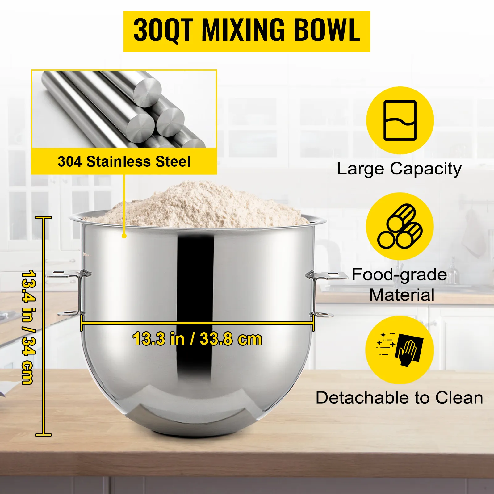 De 30Qt grote kom kan max. 3,5 kg / 7,7 lbs deeg tegelijk. De mengdelen zijn allemaal gemaakt van food-grade roestvrij staal met een nette uitstraling. Met dit eersteklasmateriaal, eenvoudige reiniging en roest- en corrosiebestendig, is het duurzaam en stevig in gebruik.