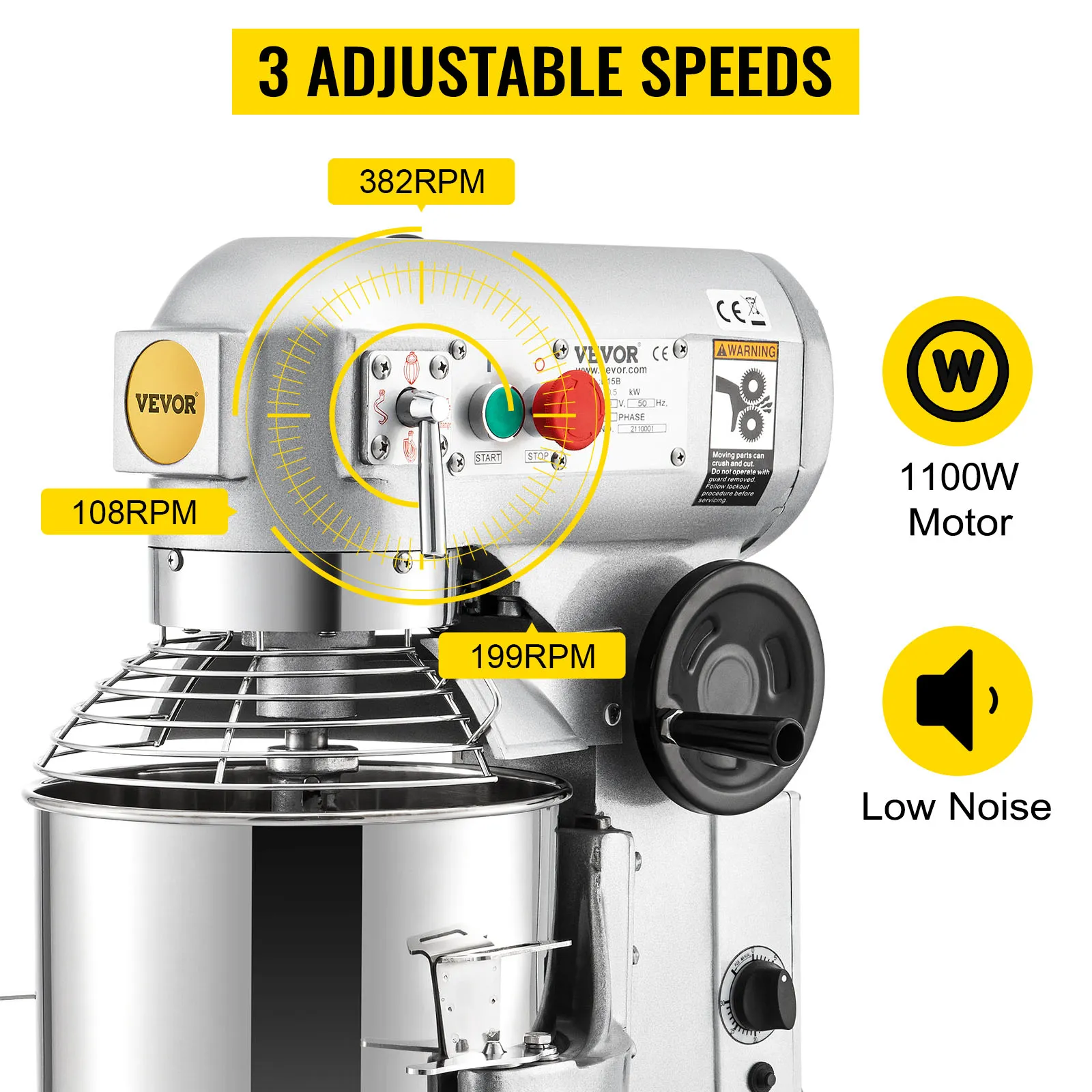 De krachtige motor van 1500 watt zorgt voor een stabiele werking en biedt drie instelbare mengsnelheden (108 RPM/199 RPM/382 RPM) om u te helpen uw voedsel efficiënt te mengen.