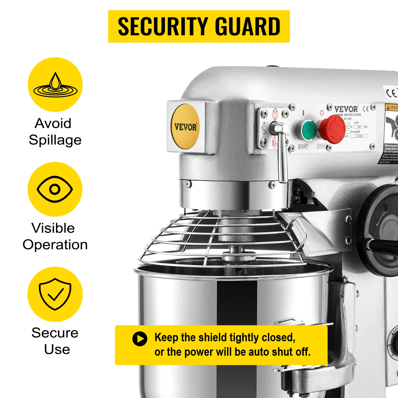 Het veilige schild kan onbedoeld letsel voorkomen. Het zorgt er ook voor dat de ingrediënten niet gaan spatten terwijl het je de binnenkant laat zien. Met de automatische uitschakelfunctie stopt deze machine onmiddellijk zodra het schild is geopend of niet goed is gesloten.
