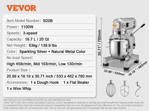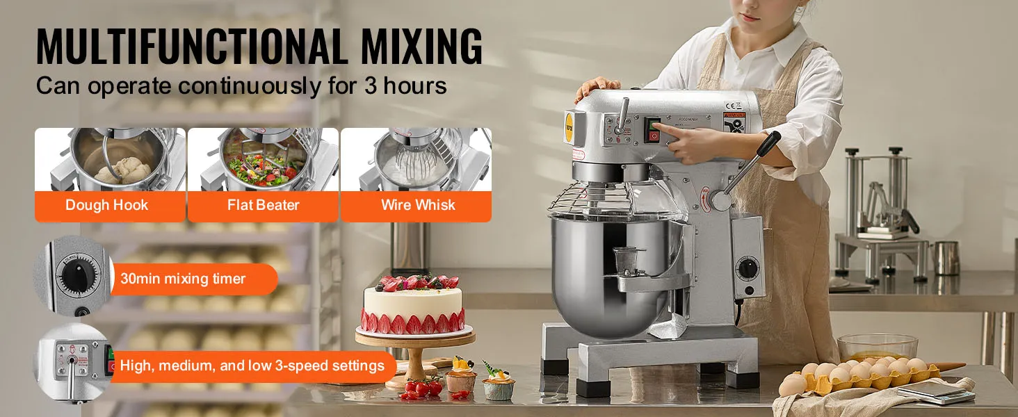 Veelzijdig: de keukenmixer is geschikt voor restaurants, hotels, pizzeria's, bakkerijen, commerciële keukens, enz. Het is ideaal voor het mengen van de meeste soorten voedsel, zoals crèmes, groenten, vullingen en deeg.