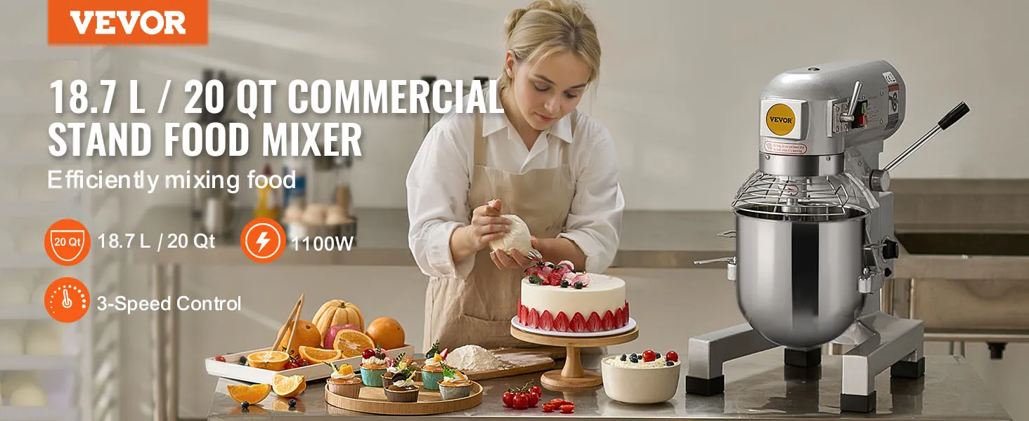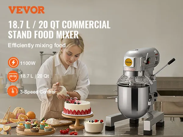 VEVOR Commerciële Keukenmixer, 18,7L Standmixer met 3 Instelbare Snelheden, 1100W Deegmixer met RVS Kom en 3 Mengopzetstukken, Ideaal voor Restaurant, Bakkerij, Banketbakkerij, Café, enz.