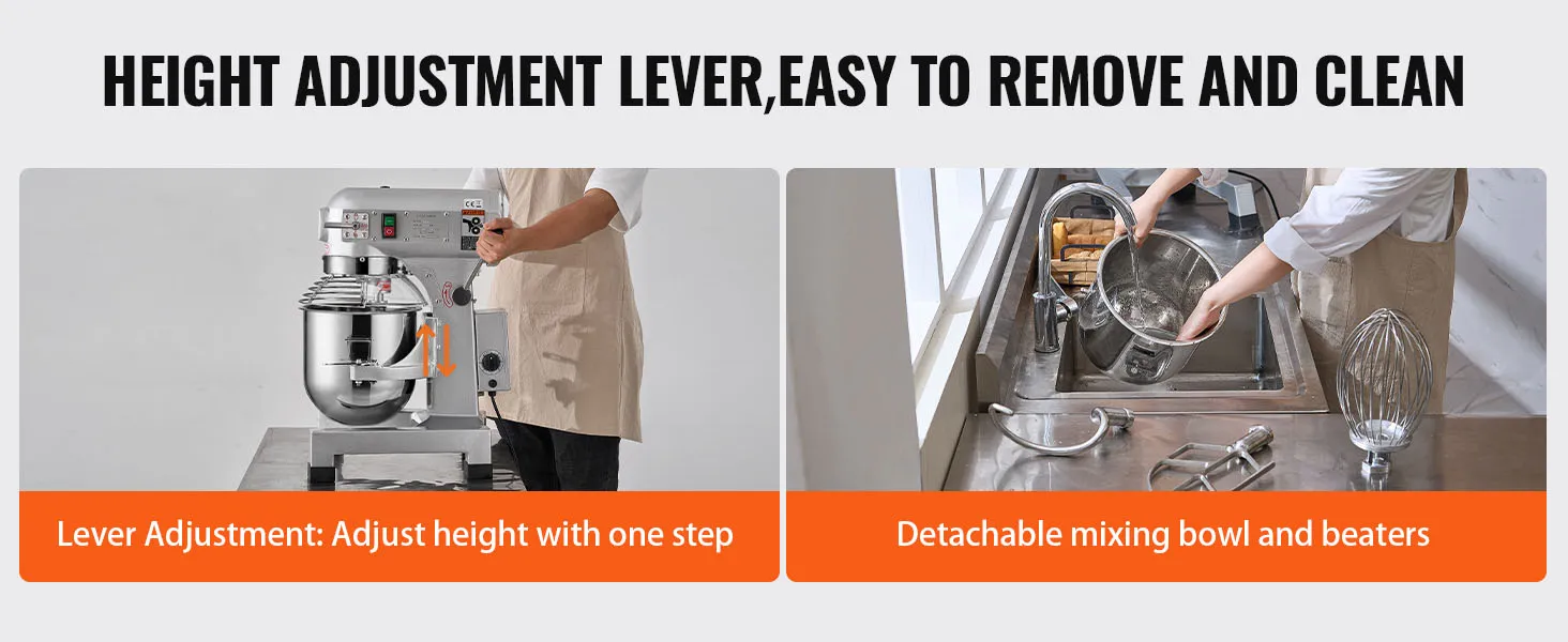 Innovatief ontwerp: de kom kan eenvoudig omhoog en omlaag worden gebracht met een hendel, wat handiger en sneller is dan traditionele instelwielen. Bovendien zijn alle onderdelen die in contact komen met voedsel, zoals kom, haken en stangen, gemaakt van food-grade roestvrij staal. Deze betrouwbare componenten zijn roest- en corrosiebestendig en gemakkelijk schoon te maken.
