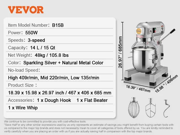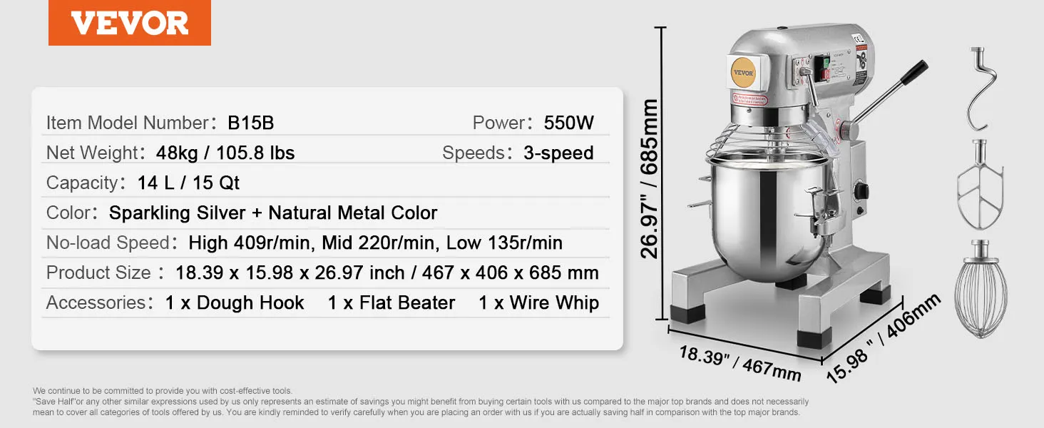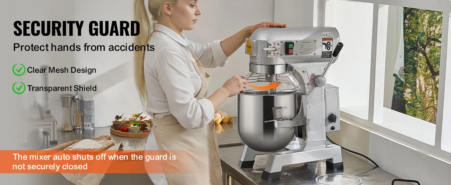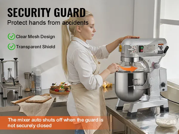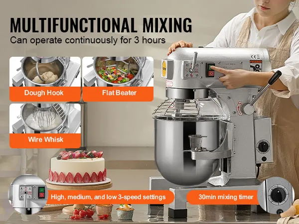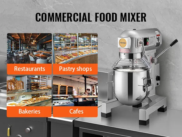 Veelzijdig: de keukenmixer is geschikt voor restaurants, hotels, pizzeria's, bakkerijen, commerciële keukens, enz. Het is ideaal voor het mengen van de meeste soorten voedsel, zoals crèmes, groenten, vullingen en deeg.
