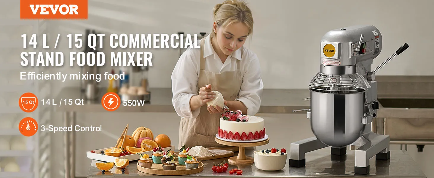 VEVOR Commerciële Keukenmixer, 14L Commerciële Standmixer met 3 Instelbare Snelheden, 550W Deegmixer met RVS Kom en 3 Menghulpstukken, Ideaal voor Restaurant, Bakkerij, Banketbakkerij, Café