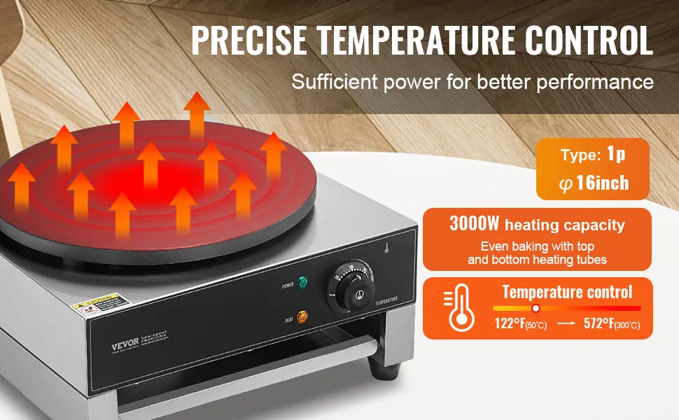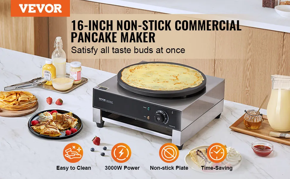 Maak snel heerlijke pannenkoeken: onze elektrische crêpemaker van 3000 W is voorzien van een grote verwarmingsplaat met een diameter van 400 mm (16 inch), waarmee u eenvoudig heerlijke wafels kunt maken. U bespaart veel tijd en geniet van een moeiteloze ontbijtervaring. Gelijkmatig verdeelde verwarmingselementen zorgen ervoor dat je wafels gelijkmatig gebakken worden. Geniet van wafels met je favoriete vulling.