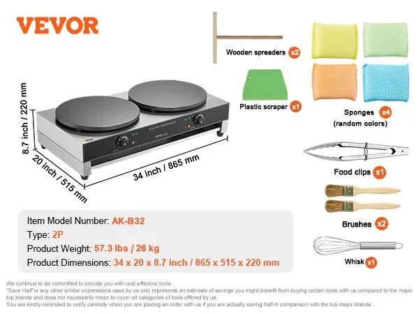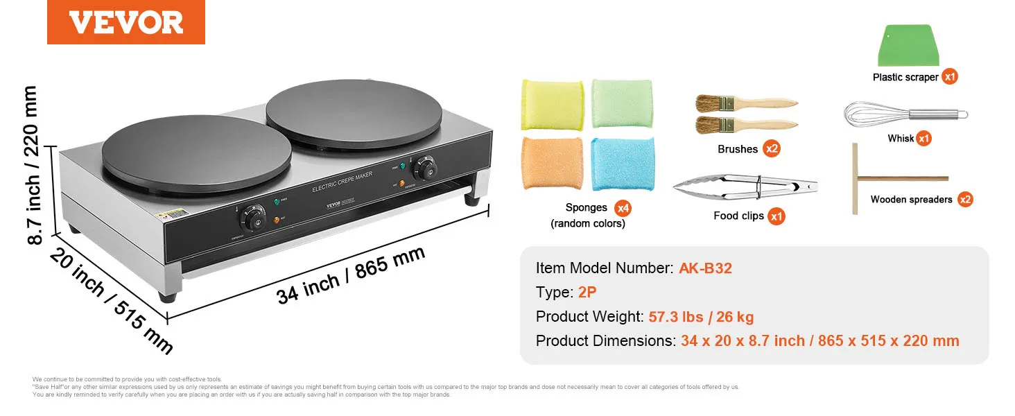 Zorgvuldig ontworpen details: gemaakt van roestvrij staal, met vier rubberen voetjes aan de onderkant om de stabiliteit tijdens het gebruik te verbeteren en een stabiele stand te garanderen. Daarnaast is deze pannenkoekmaker voorzien van diverse accessoires die het bakken makkelijker maken.