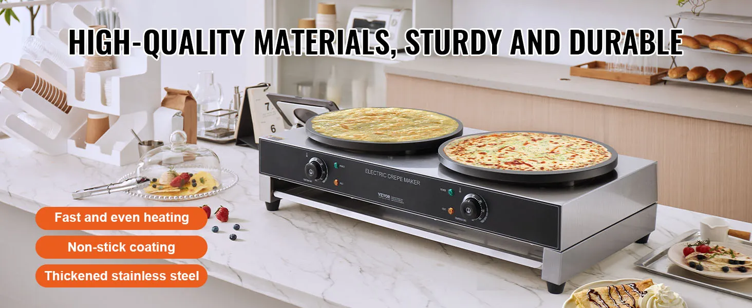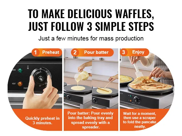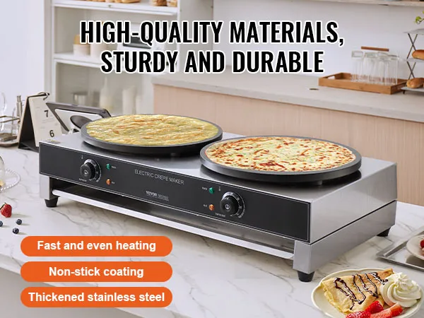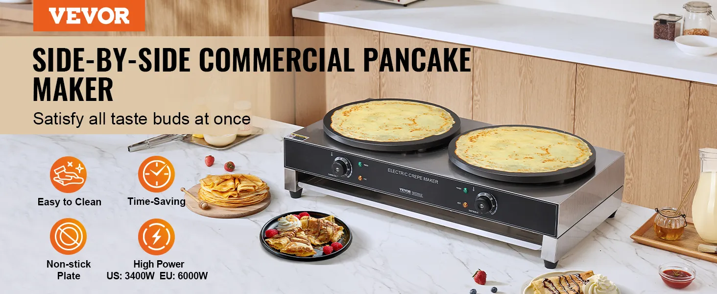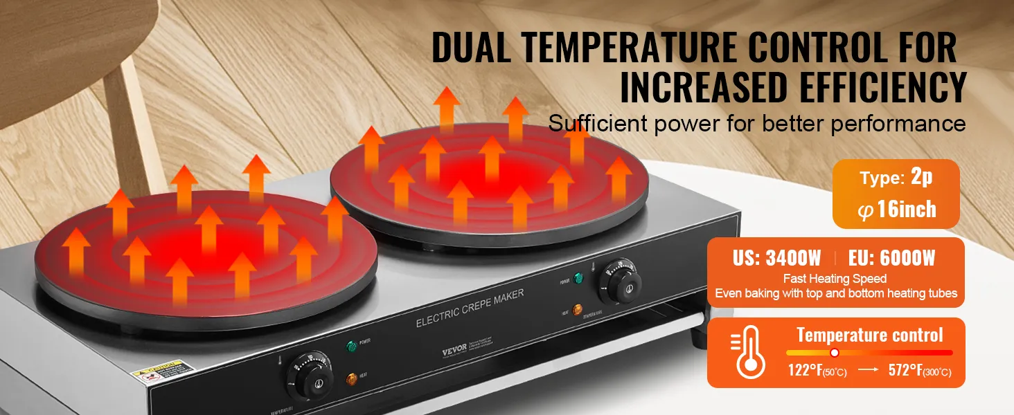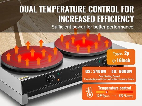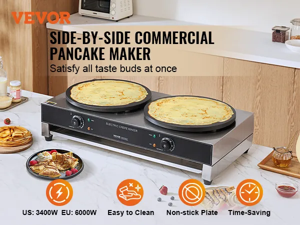 Maak snel heerlijke pannenkoeken: onze elektrische crêpemaker van 6000 W heeft twee grote verwarmingsplaten met een diameter van 400 mm (16 inch), waardoor u eenvoudig heerlijke wafels kunt maken. Je bespaart veel tijd en kunt moeiteloos ontbijten. Gelijkmatig verdeelde verwarmingselementen zorgen ervoor dat je wafels gelijkmatig gebakken worden. Geniet van wafels met je favoriete vulling.