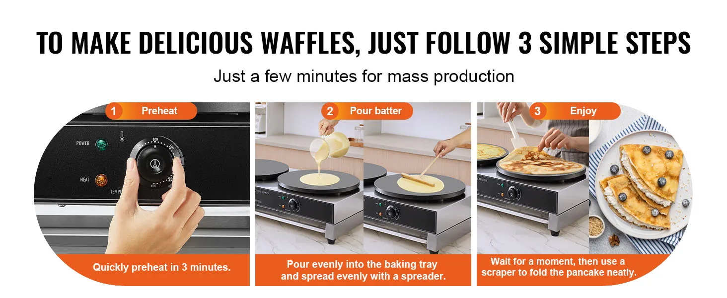 Met deze crêpemachine kunt u heerlijke wafeldesserts bereiden voor uw dessertbedrijf, om te serveren bij het ontbijt of bij de afternoon tea. Met zijn unieke paneeldesign is het een echte eyecatcher en de beste keuze voor jouw eetkraam.
