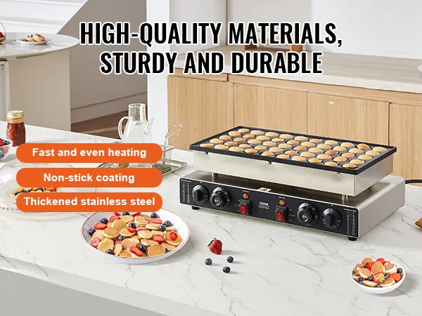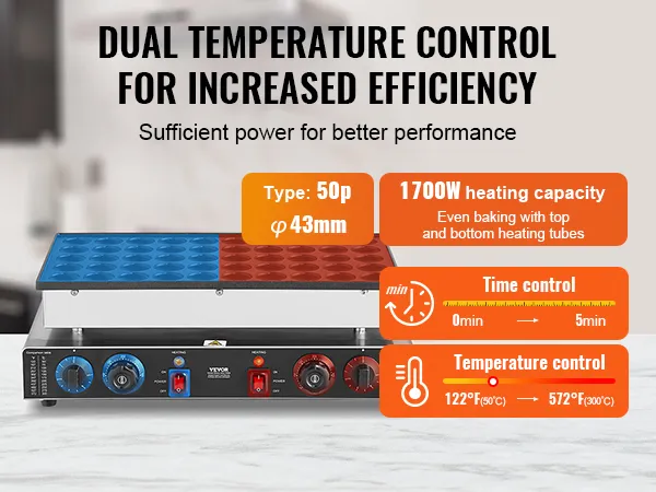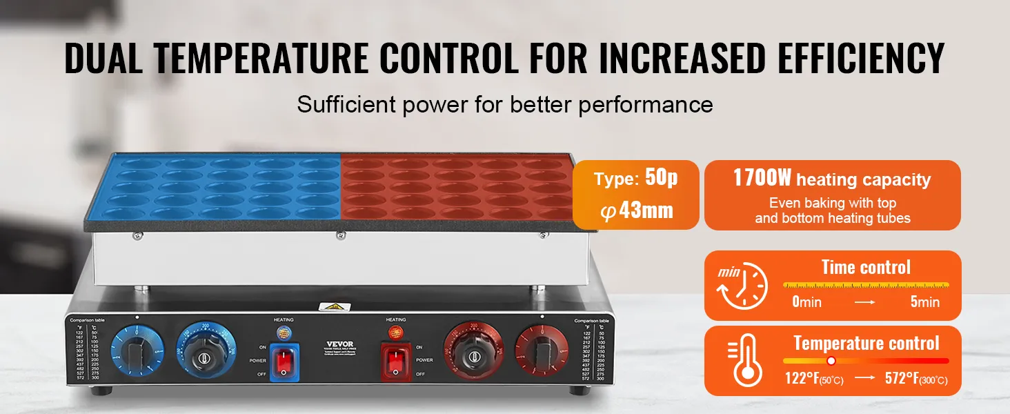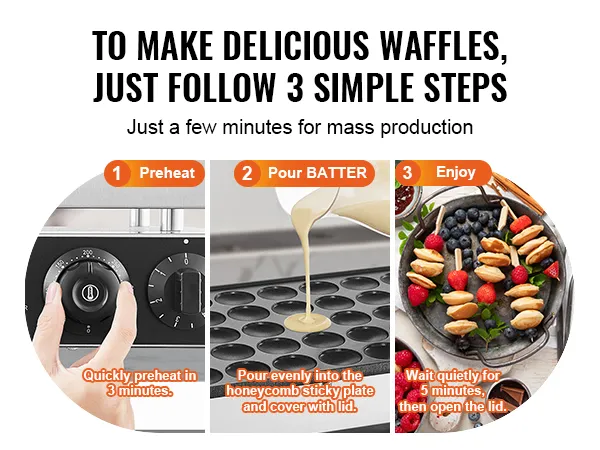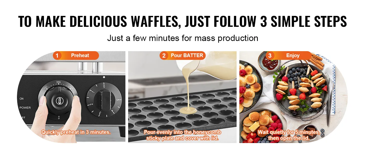 Quickly Make Delicious Pancakes: Our 1700W high-power dutch pancake maker can independently produce 50 delicious mini waffles (approximately Ø43mm) at a time, crispy on the outside and fluffy on the inside, saving you time and providing an effortless breakfast. Evenly distributed heating elements ensure your waffles are uniformly baked. Get ready to enjoy delicious waffles filled with your favorite toppings.