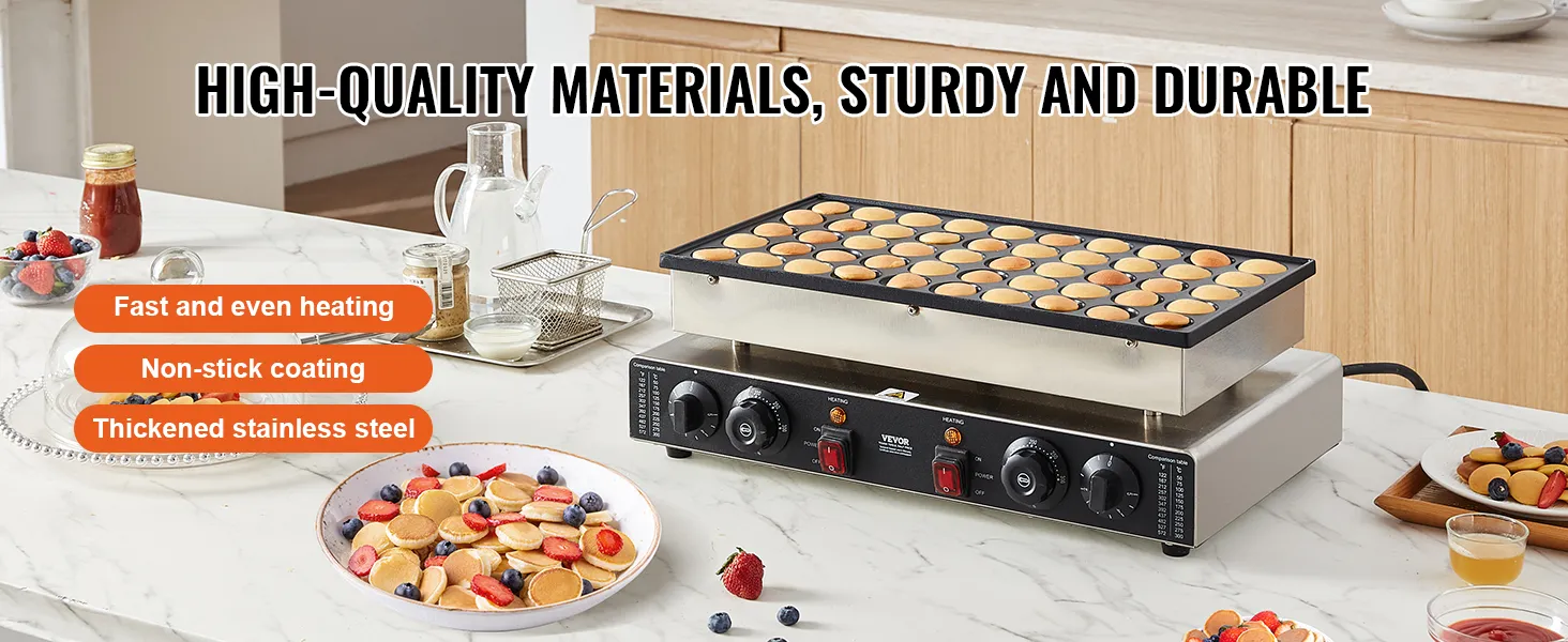 Carefully Designed Details: Made from stainless steel, four rubber feet at the base enhance the stability of our commercial electric poffertjes grill, keeping it steady during operation. The hinge connecting the two heating plates supports flexible closing and opening. Moreover, it comes equipped with a variety of accessories to assist in baking.