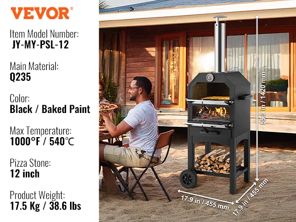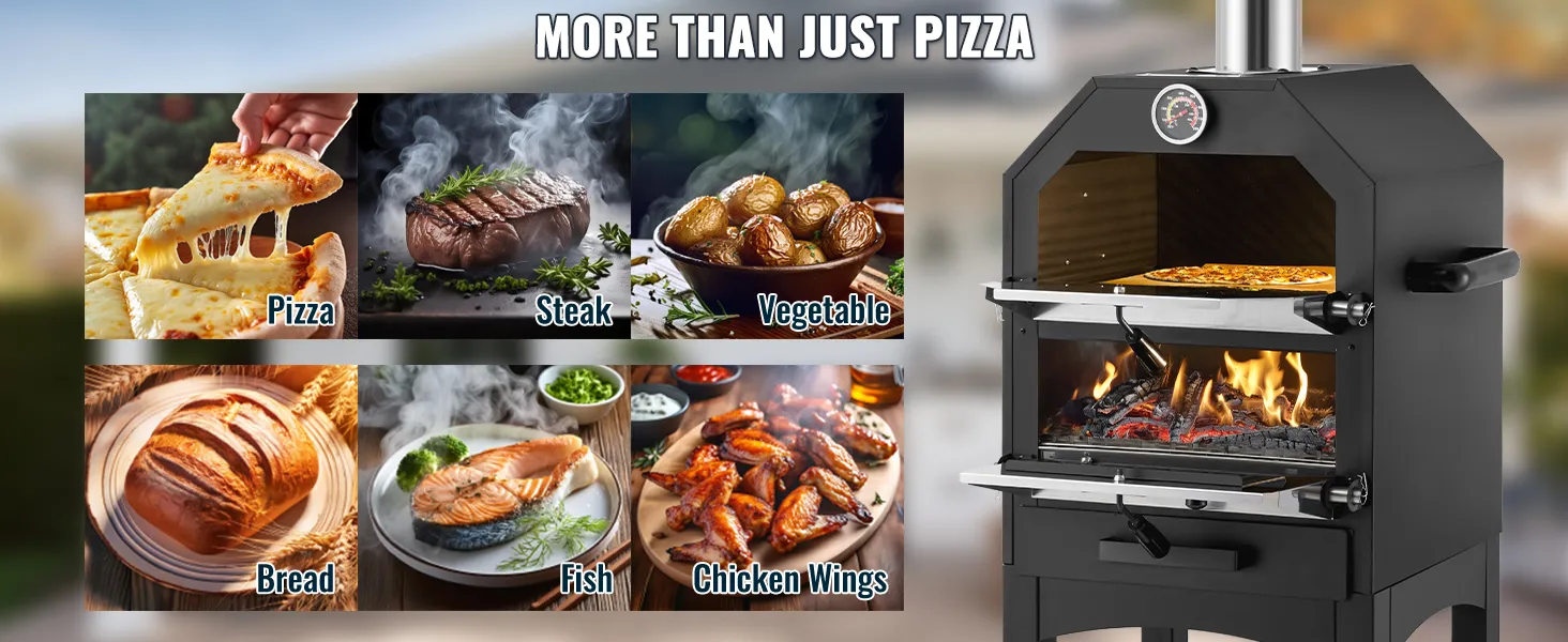 Complete accessoires: Tot de doordachte accessoires behoren een pizzasteen, twee bakplaten en twee houtskoolnetten. De hittebestendige pizzasteen heeft een hoge wateropname om een hoge oppervlaktetemperatuur te behouden en de knapperige smaak van de pizza te creëren. De roestvrijstalen bakplaten zijn eersteklas roest- en corrosiebestendig en gemakkelijk schoon te maken. De ijzeren houtskoolnetten zijn duurzaam en robuust voor het verbranden van houtskool.