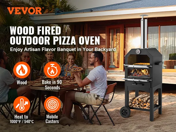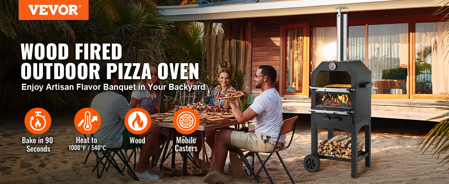 VEVOR 30,48 cm houtgestookte pizzaoven, 2-laags houtgestookte pizzaoven, houtgestookte buitenoven met 2 verwijderbare wielen, maximale temperatuur 371 °C, houtgestookte pizzaoven voor grillen
