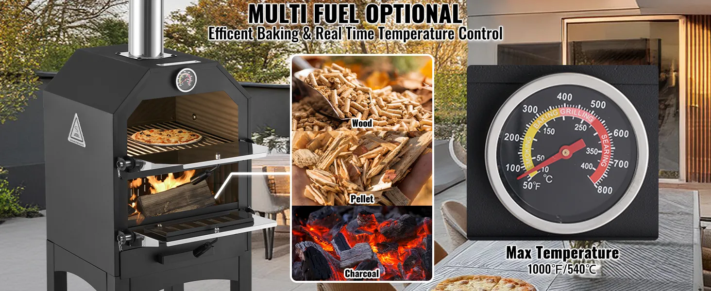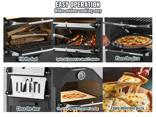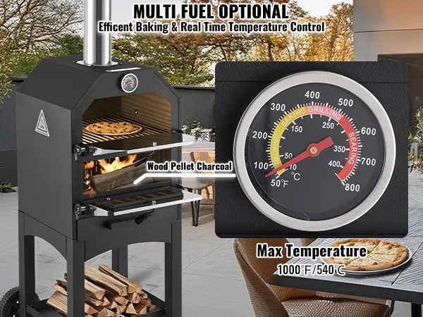 Perfecte temperatuurbehandeling: de ingebouwde thermometer geeft de maximale baktemperatuur van 700 °F in realtime weer, zodat u de vuurtemperatuur kunt regelen door houtskool nauwkeurig toe te voegen en te verminderen. Met de zwarte bakverf op het oppervlak heeft onze houtoven een hoge thermische geleidbaarheid voor een efficiënte en gelijkmatige verwarming, waardoor je in korte tijd heerlijke pizza's kunt bereiden.